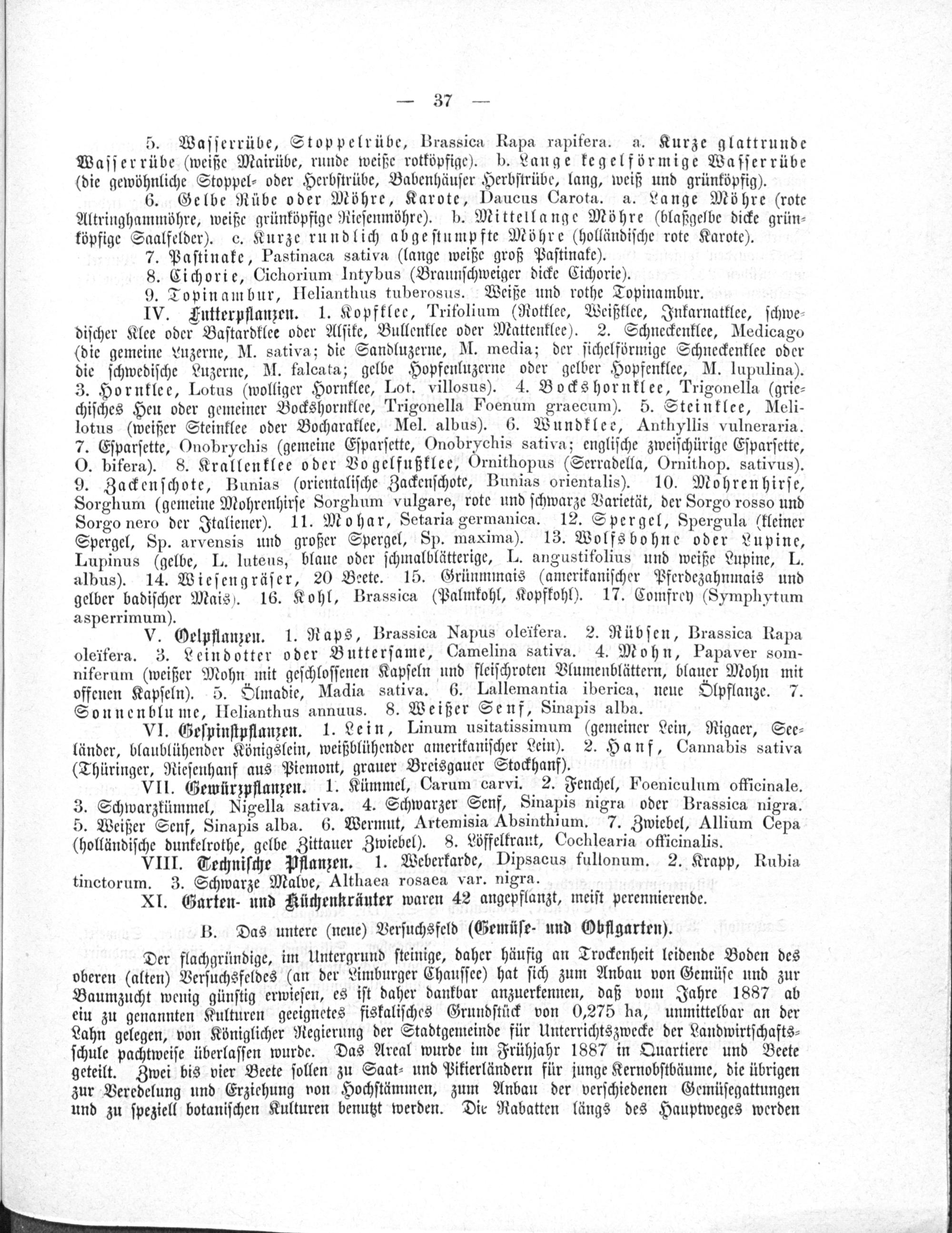 IV. Futterpflanzen. 1. Kopfklec, Trifolium(Rotklee, Weißklee, Inkarnatklee, ſchwe⸗ diſcher Klee oder Baſtardklee oder Alſike, Bullenklee oder Mattenklee). 2. Schneckenklee, Medicago (die gemeine Luzerne, M. sativa; die Sandluzerne, M. media; der ſichelförmige Schneckenklee oder die ſchwediſche Luzerne, M. falcata; gelbe Hopfenluzerne oder gelber Hopfenklee, M. lupulina). 3. Hornklee, Lotus(wolliger Hornklee, Lot. villosus). 4. Bockshornklee, Trigonella(grie⸗ chiſches Heu oder gemeiner Bockshornklee, Trigonella Foenum graecum). 5. Steinklee, Meli- lotus(weißer Steinklee oder Bocharaklee, Mel. albus). 6. Wundklee, Anthyllis vulneraria. 7. Eſparſette, Onobrychis(gemeine Eſparſette,( Dnobrychis sativa; engliſche zweiſchürige Eſparſette, O. bifera). 8. Krallenklee oder Vogelfußklee, Ornithopus(Serradella, Ornithop. sativus). 9. Zackenſchote, Bunias(orientaliſche Zackenſchote, Bunias orientalis). 10. Mohrenhirſe, Sorghum(gemeine Mohrenhirſe Sorghum vulgare, rote und ſchwarze Varietät, der Sorgo rosso und Sorgo nero der Italiener). 11. Mohar, Setaria germanica. 12. Spergel, Spergula(kleiner Spergel, Sp. arvensis und großer Spergel, Sp. maxima). 13. Wolfsbohne oder Lupine, Lupinus(gelbe, L. luteus, blaue oder ſchmalblätterige, L. angustifolius und weiße Lupine, L. albus). 14. Wieſengräſer, 20 Beete. 15. Grünmmais(amerikaniſcher Pferdezahnmais und gelber badiſcher Mais). 16. Kohl, Brassica(Palmkohl, Kopfkohl). 17. Comfrey(Symphytum asperrimum)...