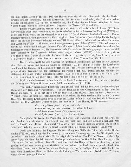 Noch echt heidnisch ist hingegen die Vorstellung vom Neide der Götter, der nichts Großes duldet(VII 10),(cf. Ring des Polykrates!). Aber diese UÜberzeugung von der Nichtigkeit alles Irdischen ist ein Produkt der tiefen Frömmigkeit Herodots. Der Fall des Xerxes ist die Folge jener 50½, wie denn der Schriftsteller überhaupt in dem Gang der Geschichte überall das gerechte Walten der Gottheit erblickt. Deshalb schreibt er auch das Hauptverdienst an dem Sieg in dem großen Völkerringen demütig der Gottheit zu und erinnert dadurch an die gerade durch ihre christliche Demut um so heller leuchtende Heldengestalt des hochseligen Kaisers Wilhelm I., der nach dem glorreichen Siege von Sedan die denkwürdigen Worte schrieb:„Welch' eine Wendung durch Gottes gnädige Führung“.