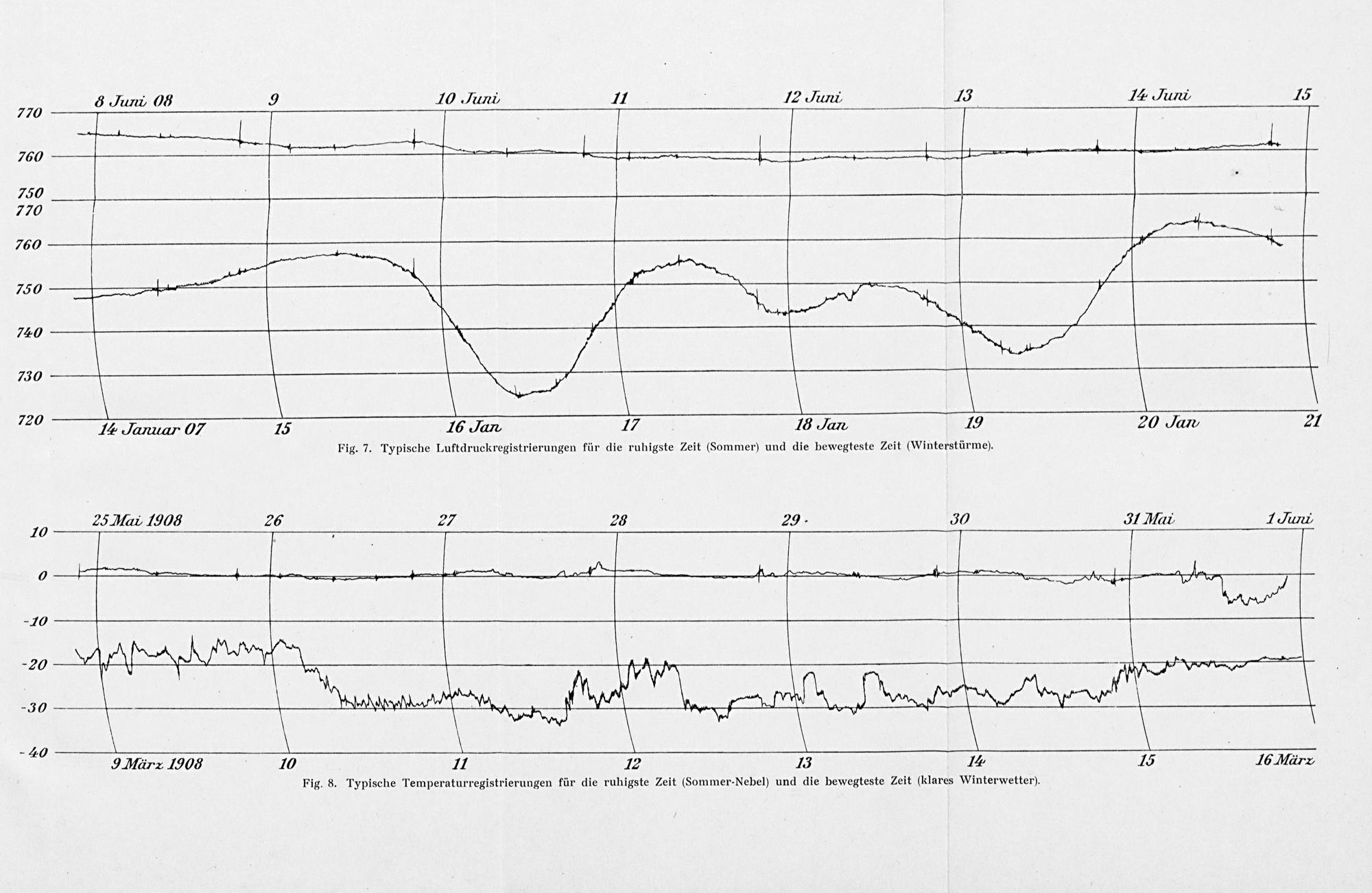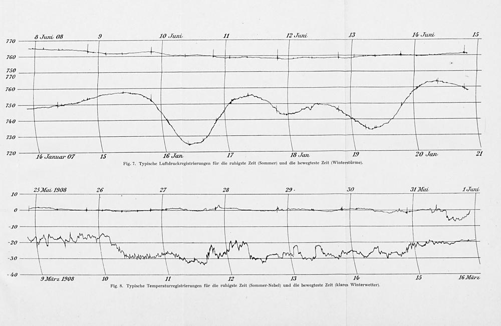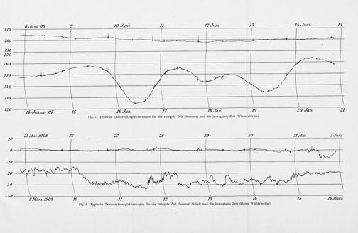 275 ure O0 9 TI0 Jani, II I2 arer, 13 Iã arel- 13 1—-————— 750 770 ——— 1 760 750——— 338* 2' 7. Seu Ia. Jaer 7 13 T5 Jan V Ta Jan 79 20 Jan⸗ 27 Fig. 7. Typische Luftdruckregistrierungen für die ruhigste Zeit(Sommer) und die bewegteste Zeit(Winterstürme). 75 25 Mar, I1906 26 27 2⁰⁵ 29⸗ 30 I Matr- TI ann, 0 †+— 4—— 4 44— ,———
