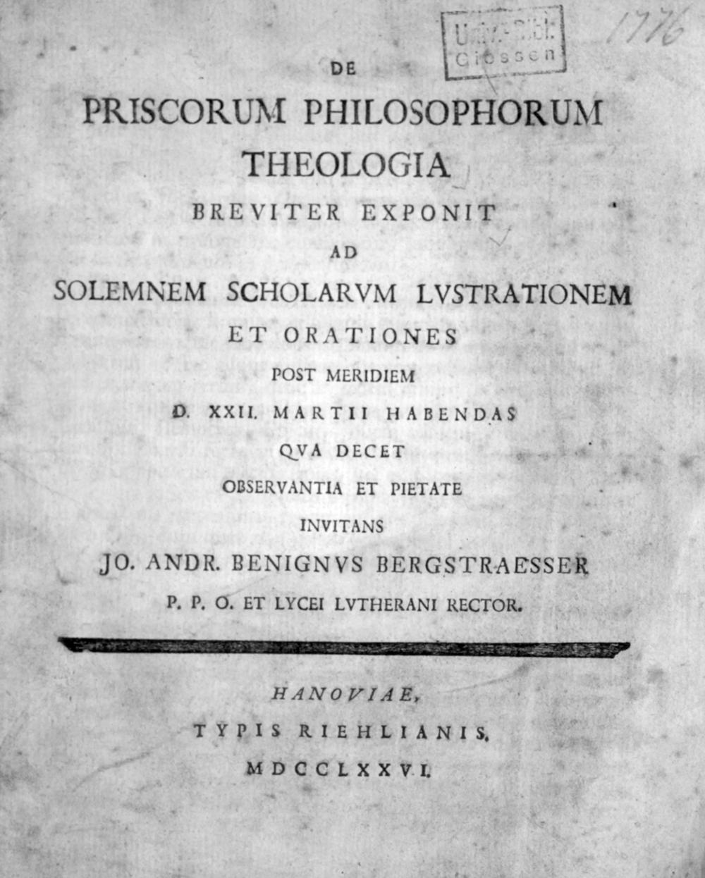 SOLEMNEM SCHOLARVM LVSTRATIONEM ET ORATIONES POST MERIDIEM D. XXII. MARTII H ABENDAS QVA DECET ObSERVANTIA ET PIETATE INVITANS. JO. ANDR. BENIGNVS BERGSTRAESSER P. P. O. ET LVYCEI LvTHERANI RECTOR.