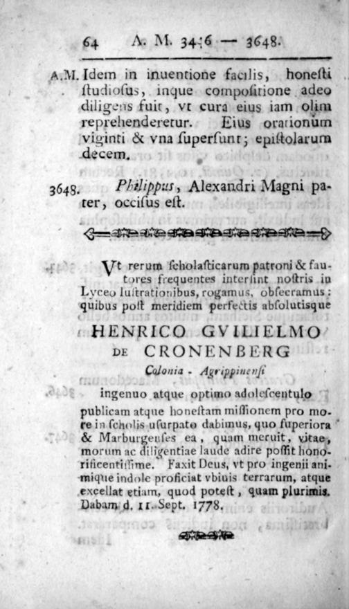 publicam atque honeſtam miſſionem pro mo. te in ſcholis uſurpato dabimus, quo fuperiora & Marburgenſes ea, quam mecuit, vitae, morum ac Fkentine laude adire pofſit bon. rificentiſſime. Faxit Deus, vt pro ingenii ani. mique indole proficiat vbiuis terrarum, atque excellat etiam, quod poteſt, quam plurimis. Dabam d. II. Sept. 1778.