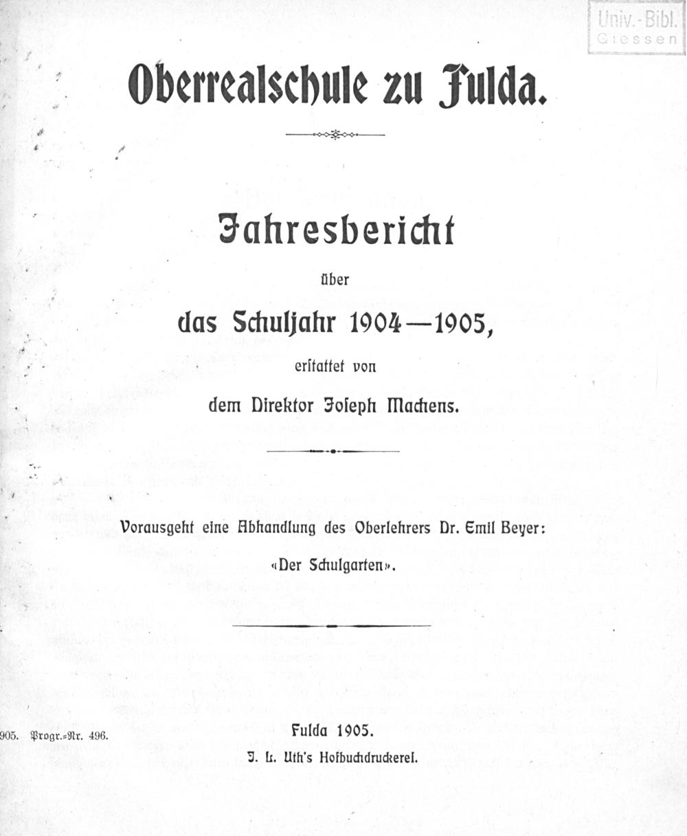 905. Progr.⸗Nr. 496. Fulda 1905. J. l. Uth's Horbuchdruckerel.