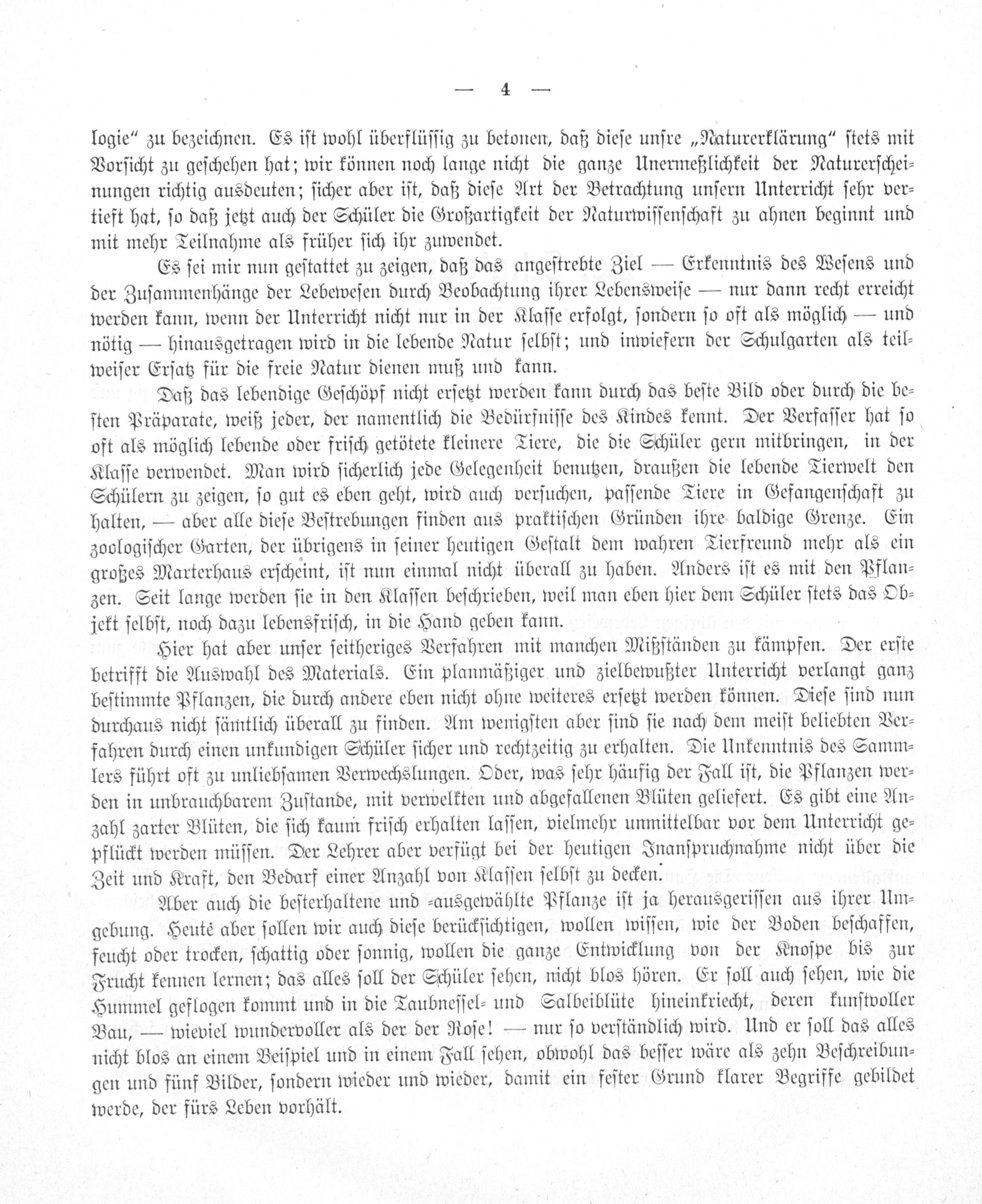 Es ſei mir nun geſtattet zu zeigen, daß das angeſtrebte Ziel— Erkenntnis des Weſens und der Zuſammenhänge der Lebeweſen durch Beobachtung ihrer Lebensweiſe— nur dann recht erreicht werden kann, wenn der Unterricht nicht nur in der Klaſſe erfolgt, ſondern ſo oft als möglich— und nötig— hinausgetragen wird in die lebende Natur ſelbſt; und inwiefern der Schulgarten als teil⸗ weiſer Erſatz für die freie Natur dienen muß und kann.