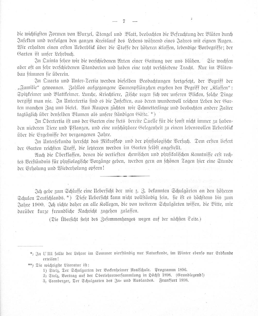 Ich gebe zum Schluſſe eine Ueberſicht der mir z. Z. bekannten Schulgärten an den höheren Schulen Deutſchlands.*) Dieſe Ueberſicht kann nicht vollſtändig ſein, ſie iſt es höchſtens bis zum Jahre 1900. Ich richte daher an alle Kollegen, die von weiteren Schulgärten wiſſen, die Bitte, mir darüber kurze freundliche Nachricht zugehen zulaſſen.