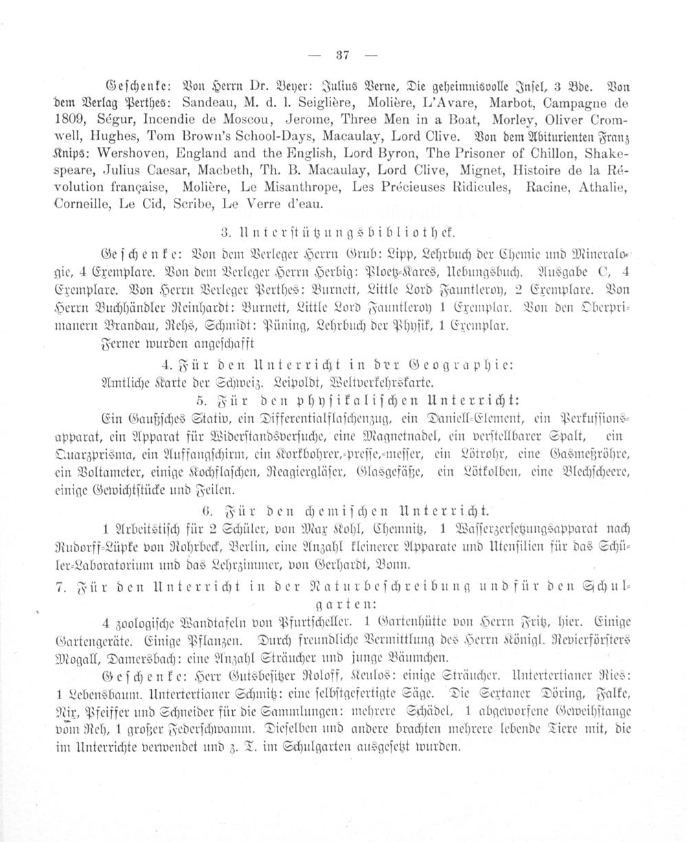 Geſchenke: Von Herrn Dr. Beyer: Julius Verne, Die geheimnisvolle Inſel, 3 Bde. Von dem Verlag Perthes: Sandeau, M. d. l. Seiglière, Molière, L'Avare, Marbot, Campagne de 1809, Ségur, Incendie de Moscou, Jerome, Three Men in a Boat, Morley, Oliver Crom- well, Hughes, Tom Browu's School-Days, Macaulay, Lord Clive. Von dem Abiturienten Franz Knips: Wershoven, England and the English, Lord Byron, The Prisoner of Chillon, Shake- speare, Julius Caesar, Macbeth, Th. B. Macaulay, Lord Clive, Mignet, Histoire de la Ré- volution française, Molière, Le Misanthrope, Les Précieuses Ridicules, Racine, Athalie, Corneille, Le Cid, Scribe, Le Verre d'eau.