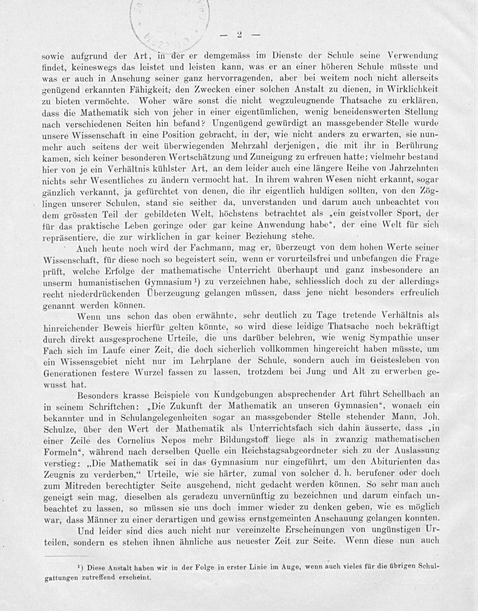 Besonders krasse Beispiele von Kundgebungen absprechender Art führt Schellbach an in seinem Schriftchen:„Die Zukunft der Mathematik an unseren Gymnasien“, wonach ein bekannter und in Schulangelegenheiten sogar an massgebender Stelle stehender Mann, Joh. Schulze, über den Wert der Mathematik als Unterrichtsfach sich dahin äusserte, dass„in einer Zeile des Cornelius Nepos mehr Bildungstoff liege als in zwanzig mathematischen Formeln“, während nach derselben Quelle ein Reichstagsabgeordneter sich zu der Auslassung verstieg:„Die Mathematik sei in das Gymnasium nur eingeführt, um den Abiturienten das Zeugnis zu verderben,“ Urteile, wie sie härter, zumal von solcher d. h. berufener oder doch zum Mitreden berechtigter Seite ausgehend, nicht gedacht werden können. So sehr man auch geneigt sein mag, dieselben als geradezu unvernünftig zu bezeichnen und darum einfach un- beachtet zu lassen, so müssen sie uns doch immer wieder zu denken geben, wie es möglich war, dass Männer zu einer derartigen und gewiss ernstgemeinten Anschauung gelangen konnten.