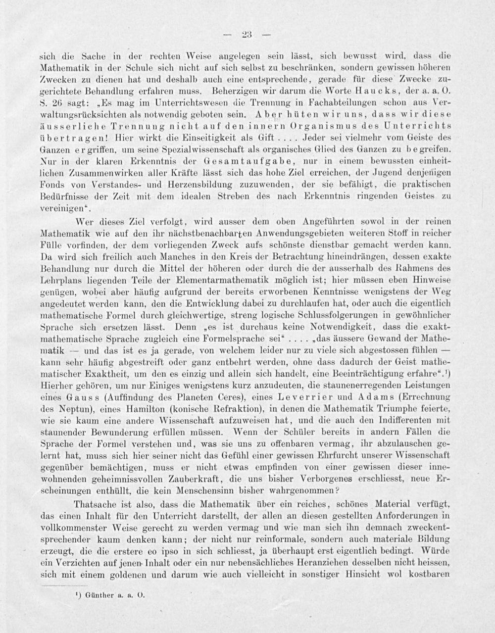 kann sehr häufig abgestreift oder ganz entbehrt werden, ohne dass dadurch der Geist mathe- matischer Exaktheit, um den es einzig und allein sich handelt, eine Beeinträchtigung erfahre“. ¹) Hierher gehören, um nur Einiges wenigstens kurz anzudeuten, die staunenerregenden Leistungen eines Gauss(Auffindung des Planeten Ceres), eines Leverrier und Adams(Errechnung des Neptun), eines Hamilton(konische Refraktion), in denen die Mathematik Triumphe feierte, wie sie kaum eine andere Wissenschaft aufzuweisen hat, und die auch den Indifferenten mit staunender Bewunderung erfüllen müssen. Wenn der Schüler bereits in andern Fällen die Sprache der Formel verstehen und, was sie uns zu offenbaren vermag, ihr abzulauschen ge- lernt hat, muss sich hier seiner nicht das Gefühl einer gewissen Ehrfurcht unserer Wissenschaft gegenüber bemächtigen, muss er nicht etwas empfinden von einer gewissen dieser inne- wohnenden geheimnissvollen Zauberkraft, die uns bisher Verborgenes erschliesst, neue Er- scheinungen enthüllt, die kein Menschensinn bisher wahrgenommen?