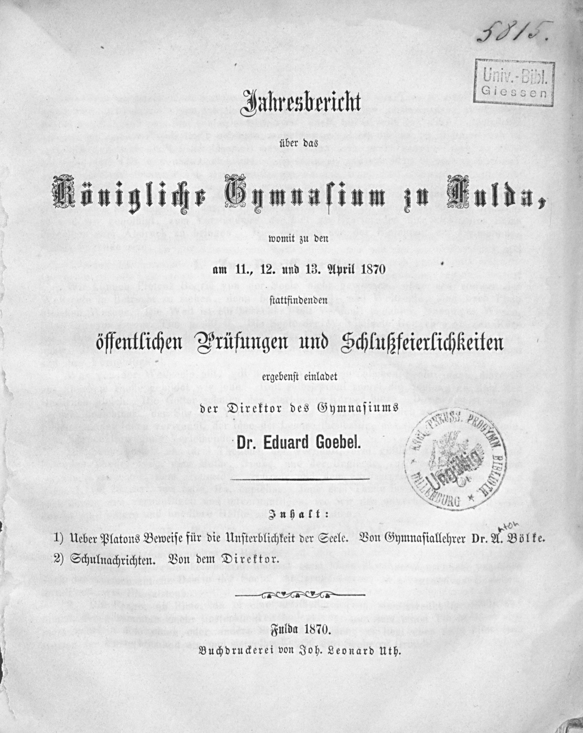 Fulda 1870. Buchdruckerei von Joh. Leonard Uth.