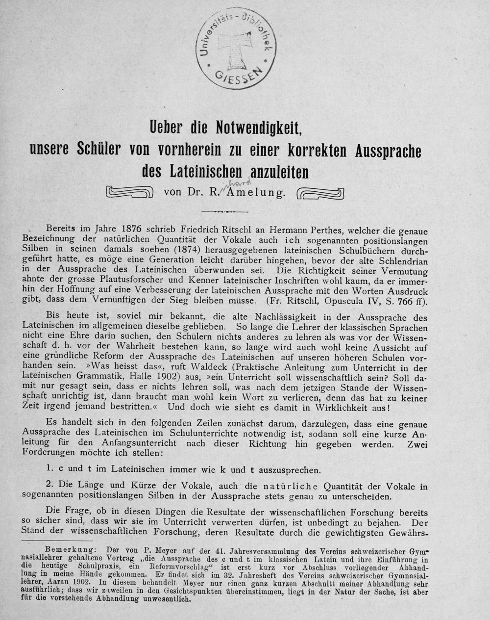 Ueber die Notwendigkeit, unsere Schüler von vornherein zu einer korrekten Aussprache des Lateinischen anzuleiten (=⁴= von Dr. R.Amelung.(——