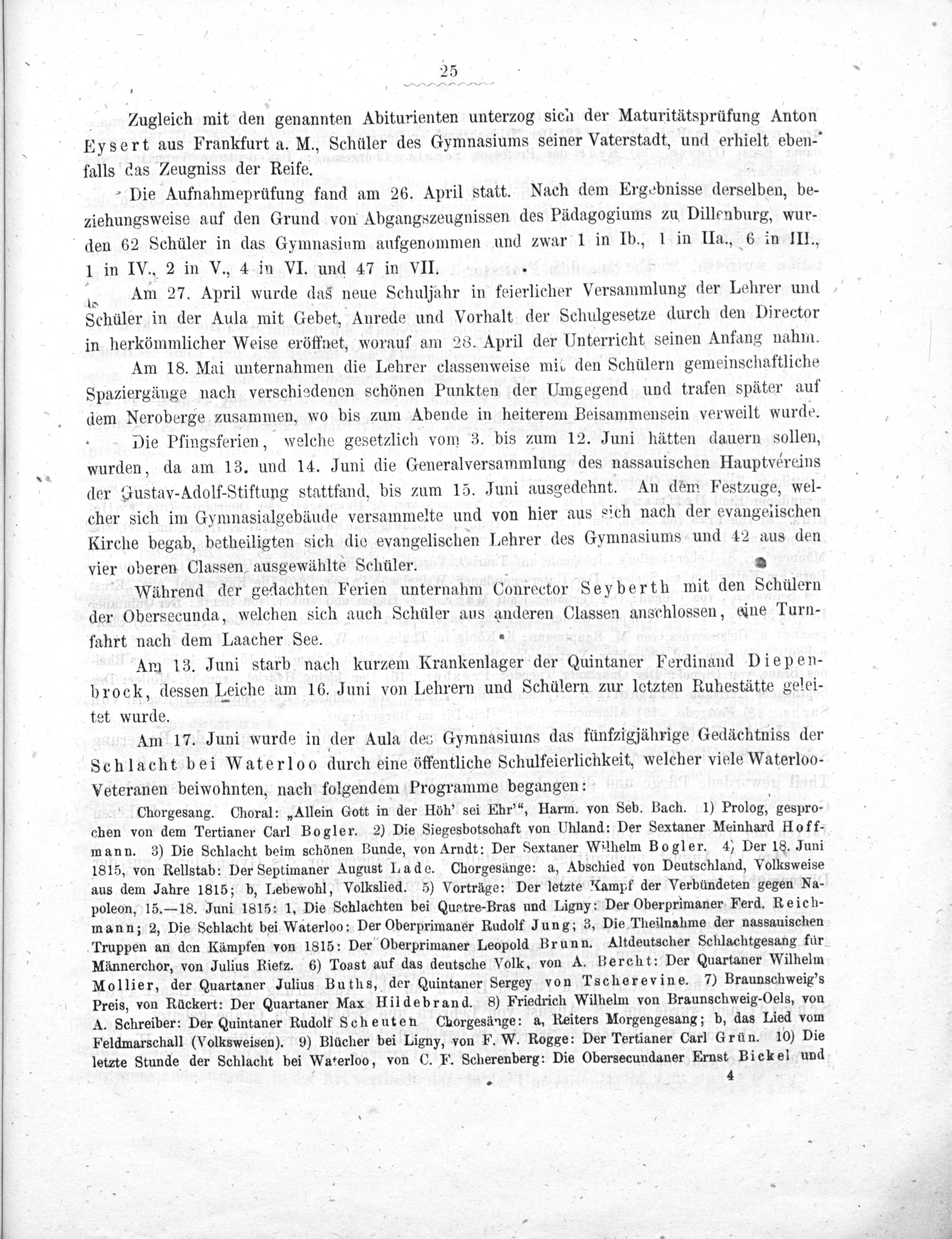 Chorgesang. Choral:„Allein Gott in der Höh' sei Ehr'“, Harm. von Seb. Bach. 1) Prolog, gespro- chen von dem Tertianer Carl Bogler. 2) Die Siegesbotschaft von Uhland: Der Sextaner Meinhard Hoff- mann. 3) Die Schlacht beim schönen Bunde, von Arndt: Der Sextaner Wilhelm Bogler. 4, Der 18. Juni 1815, von Rellstab: Der Septimaner August Lade. Chorgesänge: a, Abschied von Deutschland, Volksweise aus dem Jahre 1815; b, Lebewohl, Volkslied. 5) Vorträge: Der letzte Kampf der Verbündeten gegen Na- poleon, 15.— 18. Juni 1815: 1, Die Schlachten bei Quatre-Bras und Ligny: Der Oberprimaner Ferd. Reich- mann; 2, Die Schlacht bei Waterloo: Der Oberprimaner Rudolf Jung; 3, Die Theilnahme der nassauischen Truppen an don Kämpfen von 1815: Der Oberprimaner Leopold Brunn. Altdeutscher Schlachtgesang für Männerchor, von Julius Rietz. 6) Toast auf das deutsche Volk, von A. Bercht: Der Quartaner Wilhelm Mollier, der Quartaner Julius Buths, der Quintaner Sergey von Tscherevine. 7) Braunschweig's Preis, von Rückert: Der Quartaner Max Hildebrand. 8) Friedrich Wilhelm von Braunschweig-Oels, von A. Schreiber: Der Quintaner Rudolf Scheuten Chorgesänge: a, Reiters Morgengesang; b, das Lied vom Feldmarschall(Volksweisen). 9) Blücher bei Ligny, von F. W. Rogge: Der Tertianer Carl Grün. 10) Die letzte Stunde der Schlacht bei Waterloo, von C. F. Scherenberg: Die Obersecundaner Ernst Bickel und 4