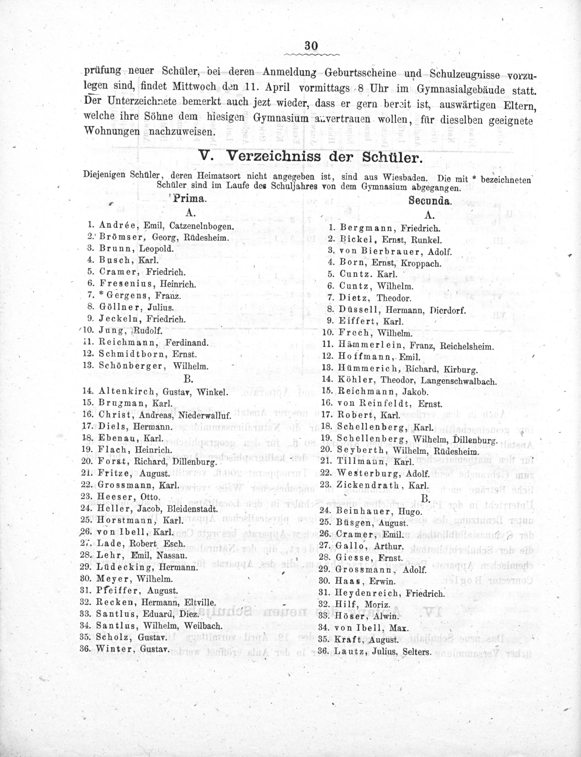 Diejenigen Schüler, deren Heimatsort nicht angegeben ist, sind aus Wiesbaden. Die mit“ bezeichneten Schüler sind im Laufe des Schuljahres von dem Gymnasium abgegangen.