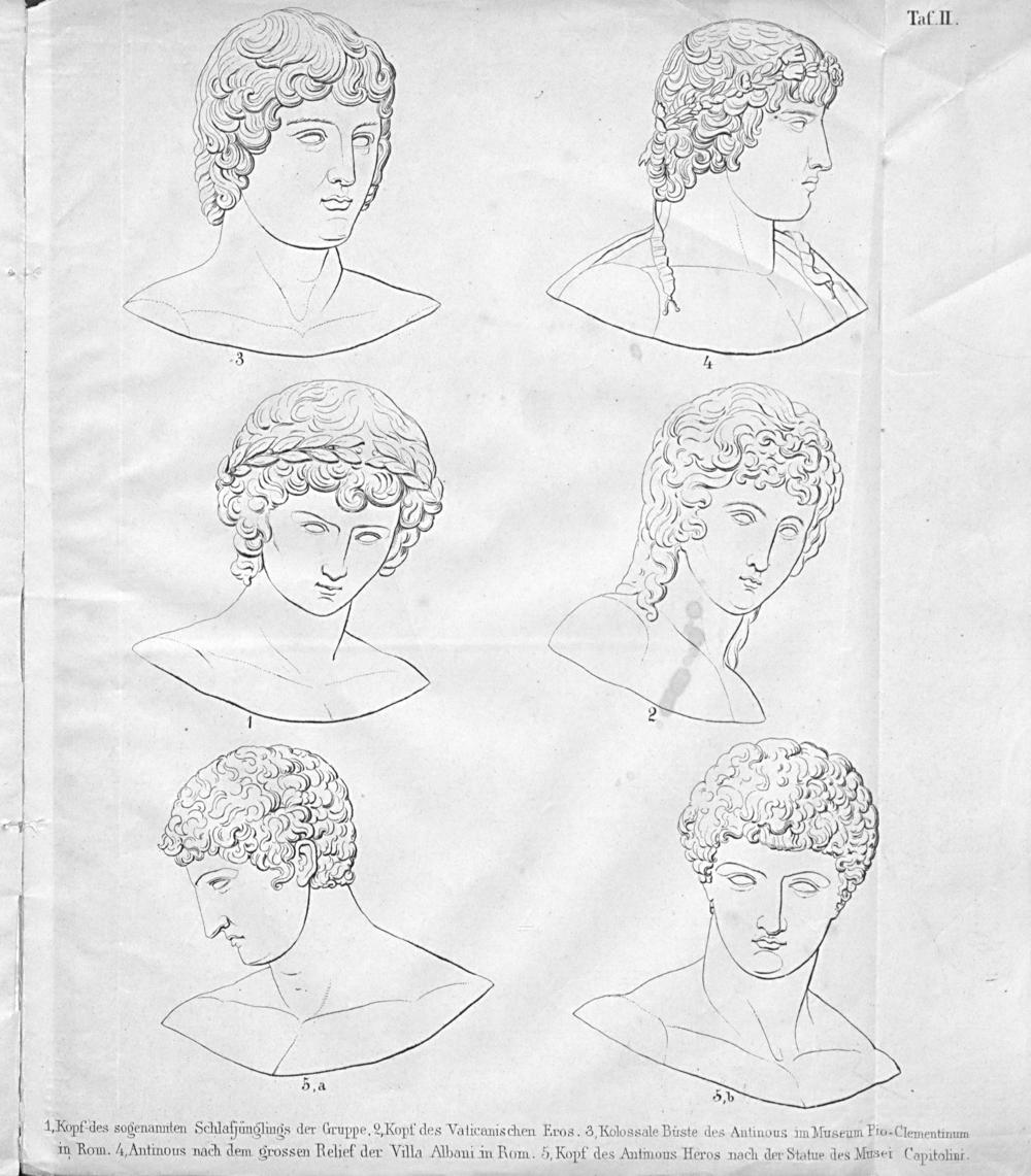 1, Kopf des sogenamiten Schlaffünlings der Gruppe. L.Kopf des Valicanischen Eros. 3, Kolossale Buste des Antinous im Museum Pio-Clementinum in Rom. 4,Antinous nach dem grossen Relief der Villa Mbani in Rom. 5, Kopf des Anfmous Heros nach der Statue des Musei Capitolint.