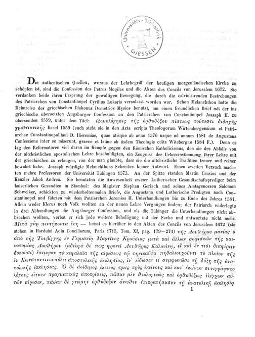 De authentischen Ouellen, woraus der Lehrbegriff der heutigen morgenländischen Kirche zu schöpfen ist, sind die Confession des Petrus Mogilas und die Akten des Concils von Jerusalem 1672. Sie verdanken beide ihren Ursprung der gewaltigen Bewegung, die durch die calvinisirenden Bestrebungen des Patriarchen von Constantinopel Cyrillus Lukaris veranlasst worden war. Schon Melanchthon hatte die Ileimreise des griechischen Diakonus Demetrios Mysios benutzt, um einen freundlichen Brief mit der ins griechische übersetzten Augsburger Confession an den Patriarchen von Constantinopel Joasaph II. zu übersenden 1559, unter dem Titel: οαμον⁶¶õſfÄK˙ 9dεν πμέοσπσαιααιςσ τυπτεστ d⁶α&eσ₰ rOοισσαιανινα Basel 1559(auch steht sie in den Acta scripta Theologorum Wirtembergensium et Patri- archae Constantinopolitani D. Hieremiae, quae utrique ab anno 1576 usque ad annum 1581 de Augustana Confessione inter se miserunt, graece et latine ab iisdem Theologis edita Witebergae 1584 F.). Denn es lag den Reformatoren viel daran im Kampfe gegen den Römischen Katholicismus, den sie des Abfalls von der altchristlichen apostolischen Lehre beschuldigten, ein Zeugniss der Uebereinstimmung ihrer Lehre mit der griechischen zu erlangen, von der man glaubte, dass sie die altchristliche Tradition treuer und reiner bewahrt habe. Joasaph würdigte Melanchthons Schreiben keiner Antwort. Einen zweiten Versuch mach- ten mehre Prefessoren der Universität Tübingen 1573. An der Spitze standen Martin Crusius und der Kanzler Jakob Andreä. Sie benutzten die Anwesenheit zweier Lutherischer Gesandtschaftsprediger beim kaiserlichen Gesandten in Stambul: des Magister Stephan Gerlach und seines Amtsgenossen Salomon Schweiker, schickten zu wiederholtenmalen Briefe, die Augustana und Lutherische Predigten nach Con- stantinopel und führten mit dem Patriarchen Jeremias II. Unterhandlungen bis zu Ende des Jahres 1581, Allein weder Klerus noch Volk wollten an der neuen Lehre Vergnügen finden; der Patriarch widerlegte in drei Abhandlungen die Augsburger Confession, und als die Tübinger die Unterhandlungen nicht ab- drechen wollten, verbat er sich jede weitere Behelligung mit der Sachc und antwortete nicht mehr. AMecd 7 Tevτννυωνπναď eri— heisst es hierüber in den Akten des Concils von Jerusalem 1672(sie