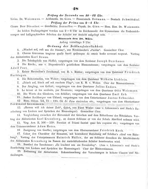 An beiden Prüfungstagen werden von 2— 4 Uhr im Zeichensaale des Gymnasiums die Probezeich- nungen und kalligraphischen Arbeiten der Schüler zur Ansicht aufgelegt sein. Mittwoch den 28. März. Anfang vormittags 9 Uhr. Ordnung der Schlussfeierliehkeit. 1.„Wachet auf, ruft uns die Stimme“, aus Mendelssohn's„Paulus“. Gemischter Chor. 2. Chorus Græcorum tragicus qualis fuerit quibusque de causis hodie revocari nequeat. Vortrag des Abiturienten Karl Braun. 3. Die Tabakspfeife von Pfeffel; vorgetragen von dem Sextaner Joseph Deschauer. 4 Die Kirche, aus v. Diepenbrock's geistlichem Blumenstrauss; vorgetragen von dem Sextaner Adolf Post. 5. Kaiser Maximilian's Zweikampf, von H. v. Mühler; vorgetragen von dem Ouintaner Friedrich Hartdegen. 6. Die Hohenstaufen, von Weber; vorgetragen von dem Quintaner Wilhelm Lieblein. 7.„Frisch auf, frisch auf mit raschem Flug“; von K. M. v. Weber. Chor der Männerstimmen. 8. Der Jüngling, von Gellert; vorgetragen von dem Ouartaner Julius Enders. 9. Le trésor et les souhaits, par Nivernois; vorgetragen von dem Ouartaner Otto Weismann. 10. Die Worte des Glaubens, von Schiller; vorgetragen von dem Ouartaner Emil Erhb. 11. Junker Rechberger von Uhland; vorgetragen von dem Untertertianer Justus Schneider.
