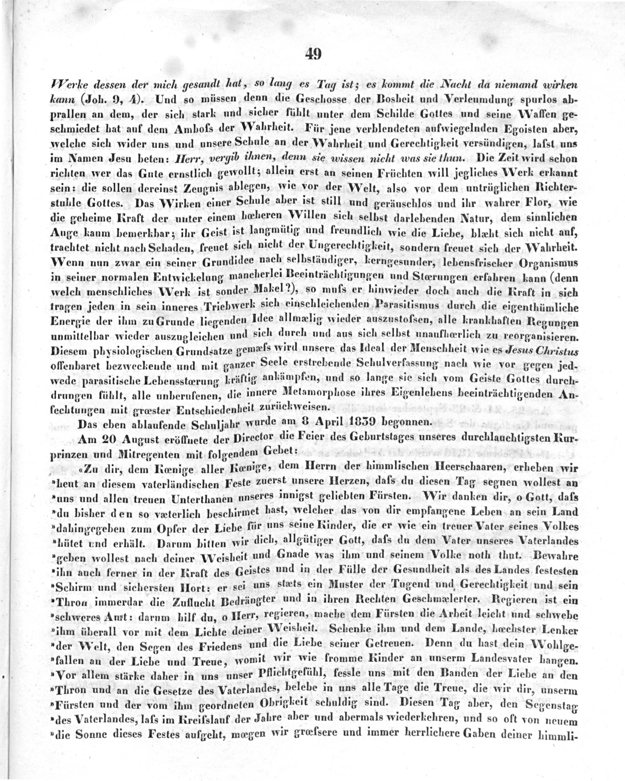 „Zu dir, dem Roœnige aller Kænige, dem Herrn der himmlischen Heerschaaren, erheben wir „heut an diesem vaterländischen Feste zuerst unsere HHerzen, daſs du diesen Tag segnen wollest an „uns und allen treuen Unterthanen unseres innigst geliebten Fürsten. Wir danken dir, o Gott, daſs „du bisher den so vcætterlich beschirmet hast, welecher das von dir empfangene Leben an sein Land „dahingegeben zum Opfer der Liebe für uns seine Rinder, die er wie ein treuer Vater seines Volkes „hütet und erhält. Darum bitten wir dich, allgütiger Gott, dafs du dem Vater unseres Vaterlandes „geben wollest nach deiner Weisheit und Gnade was ihm und seinem Volke noth thut. Bewahre »ihn auch ferner in der Rraft des Geistes und in der Fülle der Gesundheit als des Landes festesten „Schirm und sichersten Hort: er sei uns stæts ein Muster der Tugend und Gerechtigkeit und sein „Thron immerdar die Zuflucht Bedrängter und in ihren Rechten Geschmelerter. Regieren ist ein „»schweres Amt: darum hilf du, o Herr, regieren, mache dem Fürsten die Arbeit leicht und schwebe »jhm ühcrall vor mit dem Lichte deiner Weisheit. Schenke ihm und dem Lande, hœchster Lenker „der Welt, den Segen des Friedens und die Liebe seiner Getreuen. Denn du hast dein Wohlge- „fallen an der Liebe und Treue, womit wir wie fromme Rinder an unserm Landesvater hangen. „Vor allem stärke daher in uns unser Pflichtgefühl, fessle uns mit den Banden der Liebe an den „Thron und an die Gesetze des Vaterlandes, belebe in uns alle Tage die Treue, die wir dir, unserm „Fürsten und der vom ihm geordneten Obrigkeit schuldig sind. Diesen Tag aber, den Segenstag „des Vaterlandes, lafs im Rreifslauf der Jahre aber und abermals wiederkehren, und so oft von neuem »die Sonne dieses Festes aufgeht, mœgen wir grœfsere und immer herrlichere Gaben deiner himmli-