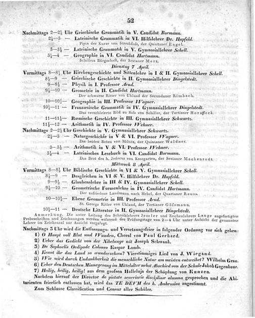 8½— 9— Griechische Geschichte in II. Gymnasiallehrer Dingelstedt. 9— 9 ½— Physik in I. Professor Arnd. 9½— 10— Geometrie in II. Candidat NHartmann.