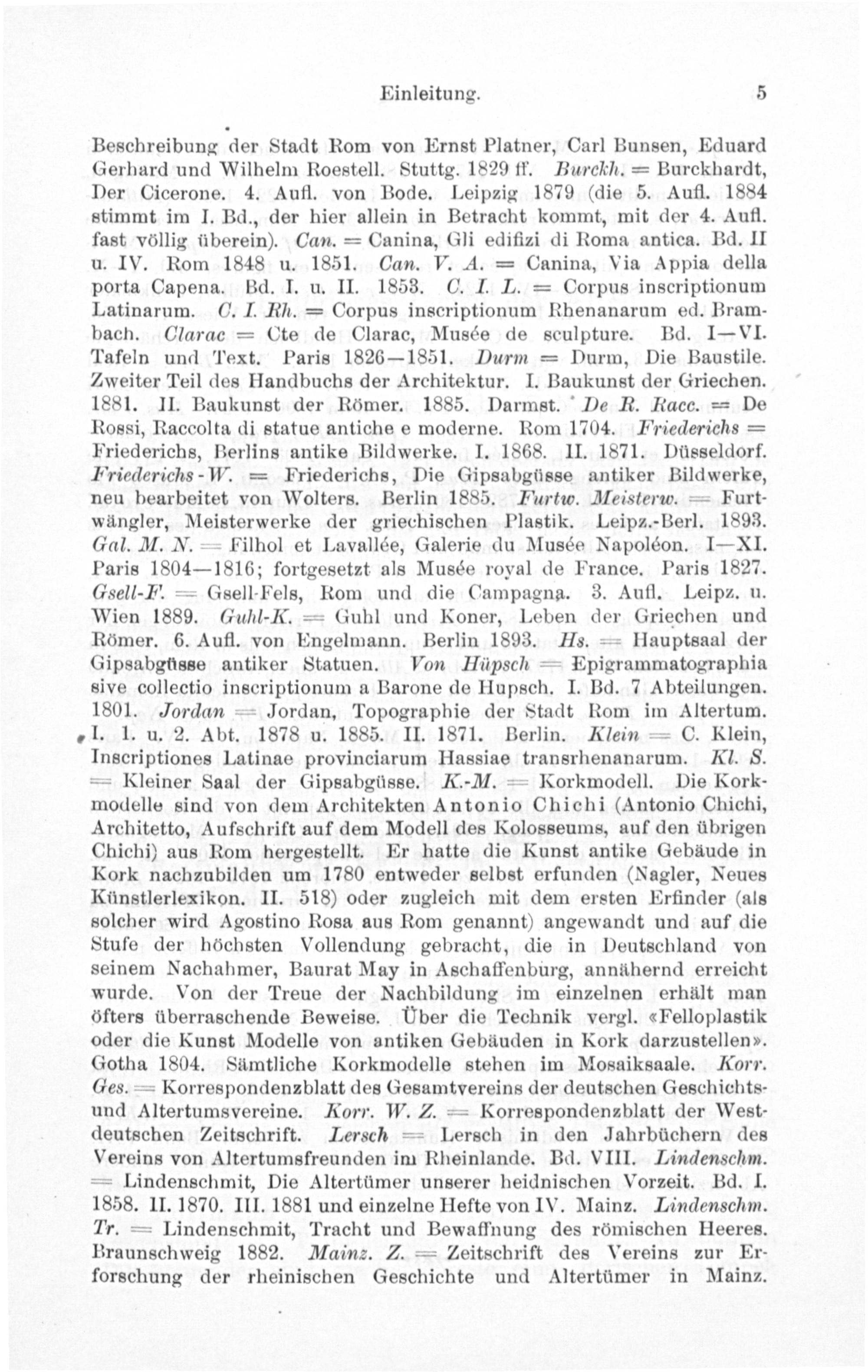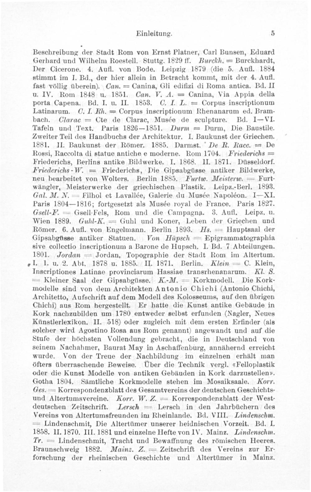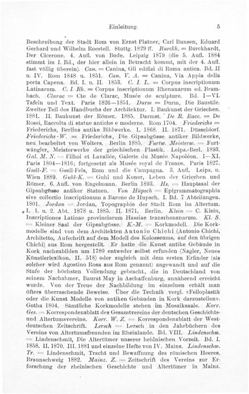 Beschreibung der Stadt Rom von Ernst Platner, Carl Bunsen, Eduard Gerhard und Wilhelm Roestell. Stuttg. 1829 ff. Burckh.= Burckhardt, Der Cicerone. 4. Aufl. von Bode. Leipzig 1879(die 5. Aufl. 1884 stimmt im I. Bd., der hier allein in Betracht kommt, mit der 4. Aufl. fast völlig überein). Can.= Canina, Gli edifizi di Roma antica. Bd. II u. IV. Rom 1848 u. 1851. Can. V. 4A.= Canina, Via Appia della porta Capena. Bd. I. u. II. 1853. C. I. L.= Corpus inscriptionum Latinarum. C. I. Fh.= Corpus inscriptionum Rhenanarum ed. Bram- bach. CGlarac= Cte de Clarac, Musée de sculpture. Bd. 1IVI. Tafeln und Text. Paris 1826— 1851. Durm= Durm, Die Baustile. Zweiter Teil des Handbuchs der Architektur. I. Baukunst der Griechen. 1881. II. Baukunst der Römer. 1885. Darmst. De R. Racc.= De Rossi, Raccolta di statue antiche e moderne. Rom 1704. Friederichs= Friederichs, Berlins antike Bildwerke. I. 1868. II. 1871. Düsseldorf. Friederichs-W.= Friederichs, Die Gipsabgüsse antiker Bildwerke, neu bearbeitet von Wolters. Berlin 1885. Furtuc. Meisterzo.= Furt- wängler, Meisterwerke der griechischen Plastik. Leipz.-Berl. 1893. Gal. M. N.= Filhol et Lavallée, Galerie du Musée Napoléon. I—XI. Paris 1804— 1816; fortgesetzt als Musée royal de France. Paris 1827. Gsell-F.= Gsell-Fels, Rom und die Campagna. 3. Aufl. Leipz. u. Wien 1889. Guhl-K.= Guhl und Koner, Leben der Griechen und Römer. 6. Aufl. von Engelmann. Berlin 1893. Hs.= Hauptsaal der Gipsabgüsse antiker Statuen. Ton Hüpsch= Epigrammatographia sive collectio inscriptionum a Barone de Hupsch. I. Bd. 7 Abteilungen. 1801. Jordan= Jordan, Topographie der Stadt Rom im Altertum. I. 1. u. 2. Abt. 1878 u. 1885. II. 1871. Berlin. Klein= C. Klein, Inscriptiones Latinae provinciarum Hassiae transrhenanarum. Kl. S. = Kleiner Saal der Gipsabgüsse. K.-M.= Korkmodell. Die Kork- modelle sind von dem Architekten Antonio Chichi(Antonio Chichi, Architetto, Aufschrift auf dem Modell des Kolosseums, auf den übrigen Chichi) aus Rom hergestellt. Er hatte die Kunst antike Gebäude in Kork nachzubilden um 1780 entweder selbst erfunden(Nagler, Neues Künstlerlexikon. II. 518) oder zugleich mit dem ersten Erfinder(als solcher wird Agostino Rosa aus Rom genannt) angewandt und auf die Stufe der höchsten Vollendung gebracht, die in Deutschland von seinem Nachahmer, Baurat May in Aschaffenburg, annähernd erreicht wurde. Von der Treue der Nachbildung im einzelnen erhält man öfters überraschende Beweise. UÜber die Technik vergl.«Felloplastik oder die Kunst Modelle von antiken Gebäuden in Kork darzustellen?. Gotha 1804. Sämtliche Korkmodelle stehen im Mosaiksaale. Korr. Ges.= Korrespondenzblatt des Gesamtvereins der deutschen Geschichts- und Altertumsvereine. Korr. W. Z.= Korrespondenablatt der West- deutschen Zeitschrift. Lersch= Lersch in den Jahrbüchern des Vereins von Altertumsfreunden im Rheinlande. Bd. VIII. Lindenschm. = Lindenschmit, Die Altertümer unserer heidnischen Vorzeit. Bd. I. 1858. II. 1870. III. 1881 und einzelne Hefte von IV. Mainz. Lindenschm. Tr.= Lindenschmit, Tracht und Bewaffnung des römischen Heeres. Braunschweig 1882. Mainz. Z.= Zeitschrift des Vereins zur Er- forschung der rheinischen Geschichte und Altertümer in Mainz.