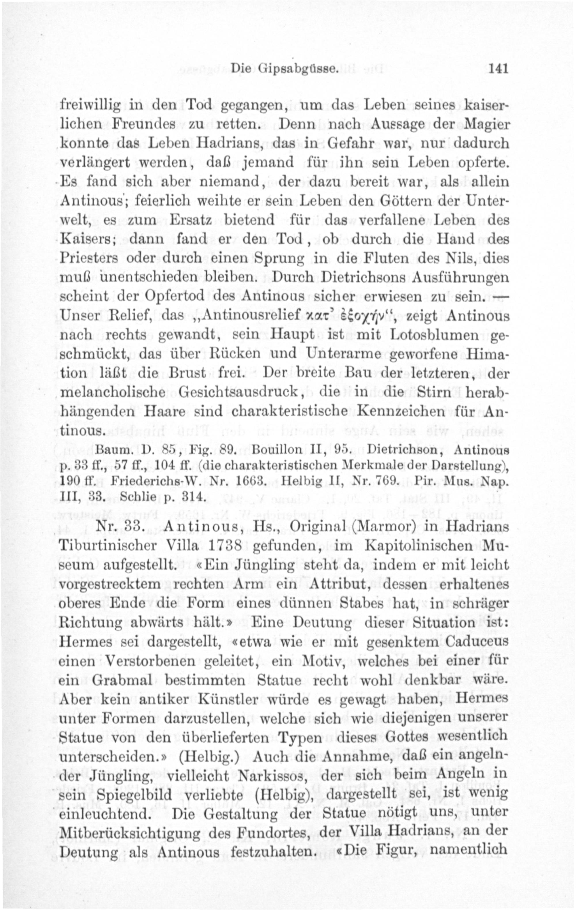 Baum. D. 85, Fig. 89. Bouillon II, 95. Dietrichson, Antinous p. 33 ff., 57 ff., 104 ff.(die charakteristischen Merkmale der Darstellung), 190 ff. Friederichs-W. Nr. 1663. Helbig II, Nr. 769. Pir. Mus. Nap. III, 33. Schlie p. 314.