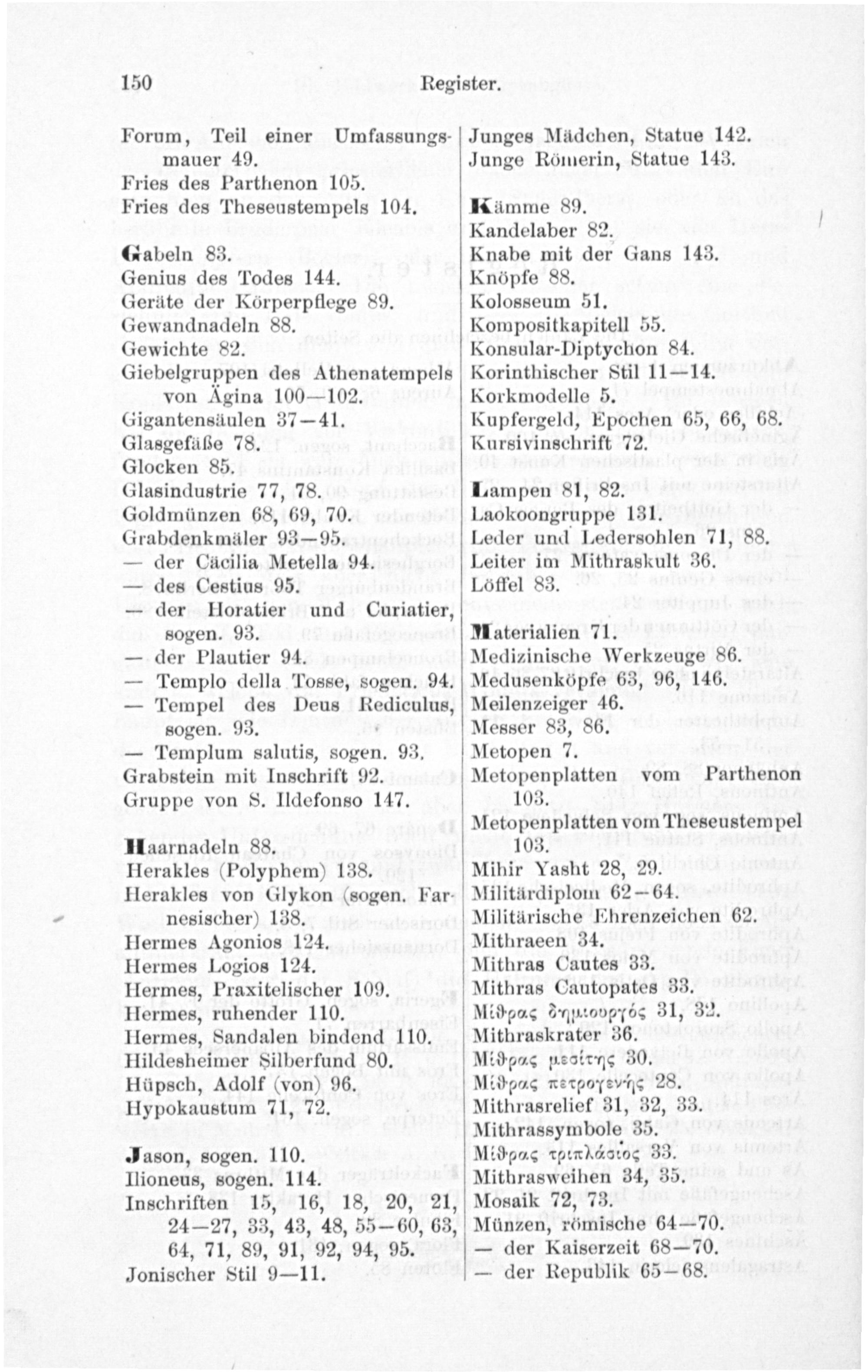 Kolosseum 51. Kompositkapitell 55. Konsular-Diptychon 84. Korinthischer Stil 11—14. Korkmodelle 5. Kupfergeld, Epochen 65, 66, 68. Kursivinschrift 72.
