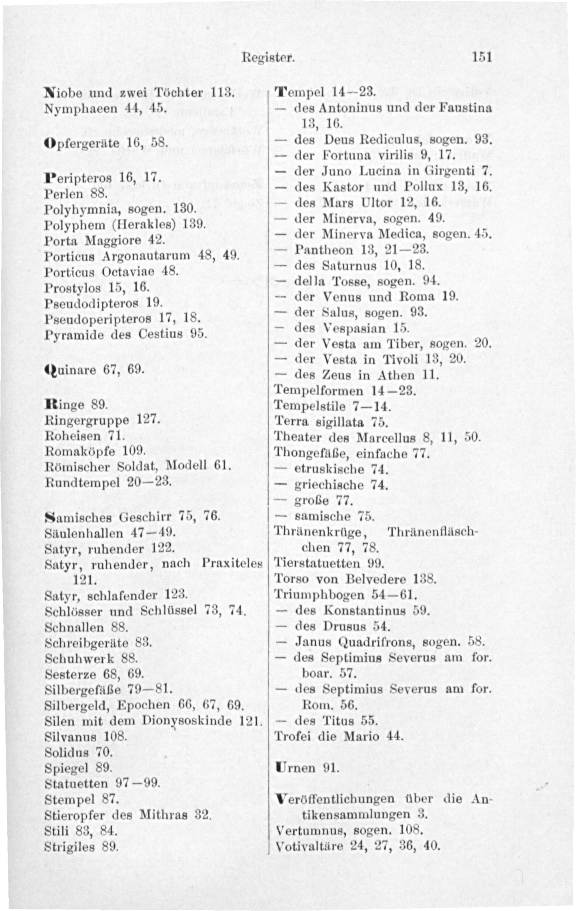 Polyhymnia, sogen. 130. Polyphem(Herakles) 139. Porta Maggiore 42. Porticus Argonautarum 48, 49. Porticus Octaviae 48. Prostylos 15, 16. Pseudodipteros 19. Pseudoperipteros 17, 18. Pyramide des Cestius 95.
