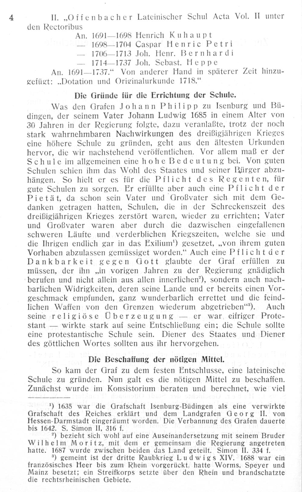 Was den Grafen Johann Philipp zu lsenburg und Bü— dingen, der seinem Vater Johann Ludwig 1685 in einem Alter von 30 Jahren in der Regierung folgte, dazu veranlaßte, trotz der noch stark wahrnehmbaren Nachwirkungen des dreißigijährigen Krieges eine höhere Schule zu gründen, geht aus den ältesten Urkunden hervor, die wir nachstehend veröffentlichen. Vor allem maß er der Schule im allgemeinen eine hohe Bedeutung bei. Von guten Schulen schien ihm das Wohl des Staates und seiner Bürger abzu— hnängen. So hielt er es für die Pflicht des Regenten, für gute Schulen zu sorgen. Er erfüllte aber auch eine Pflicht der Pietät, da schon sein Vater und Großvater sich mit dem Ge— danken getragen hatten, Schulen, die in der Schreckenszeit des dreißigjährigen Krieges zerstört waren, wieder zu errichten; Vater und Großvater waren aber durch die dazwischen eingefallenen schweren Läufte und verderblichen Kriegszeiten, welche sie und die Ihrigen endlich gar in das Exilium!) gesetzet,„von ihrem guten Vorhaben abzulassen gemüssiget worden.“ Auch eine Pflichtder Dankbarkeit gegen(ott glaubte der GCraf erfüllen zu müssen, der ihn„in vorigen Jahren zu der Regierung gnädiglich berufen und nicht allein aus allen innerlichen“*), sondern auch nach- barlichen Widrigkeiten, deren seine Lande und er bereits einen Vor-— geschmack empfunden, ganz wunderbarlich errettet und die feind- lichen Waffen von den Orenzen wiederum abgetrieben“). Auch seine religiöse UÜberzeugung— er war eifriger Prote-— stant— wirkte stark auf seine Entschließung ein; die Schule sollte eine protestantische Schule sein. Diener des Staates und Diener des göttlichen Wortes sollten aus ihr hervorgehen.
