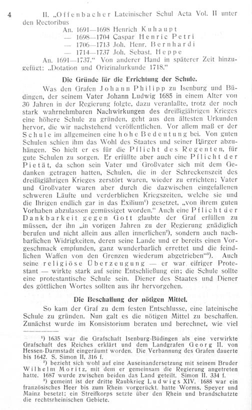 II.„Offenbacher Lateinischer Schul Acta Vol. II unter den Rectoribus An. 1691— 1698 Henrich Kuhaupt — 1608— 1704 Caspar Henric Petri — 1706— 1713 Joh. Henr. Bernhardi — 1714—1737 Joh. Sebast. Heppe An. 1691— 1737.“ Von anderer Hand in späterer Zeit hinzu— gefügt:„Dotation und Originalurkunde 1718.“