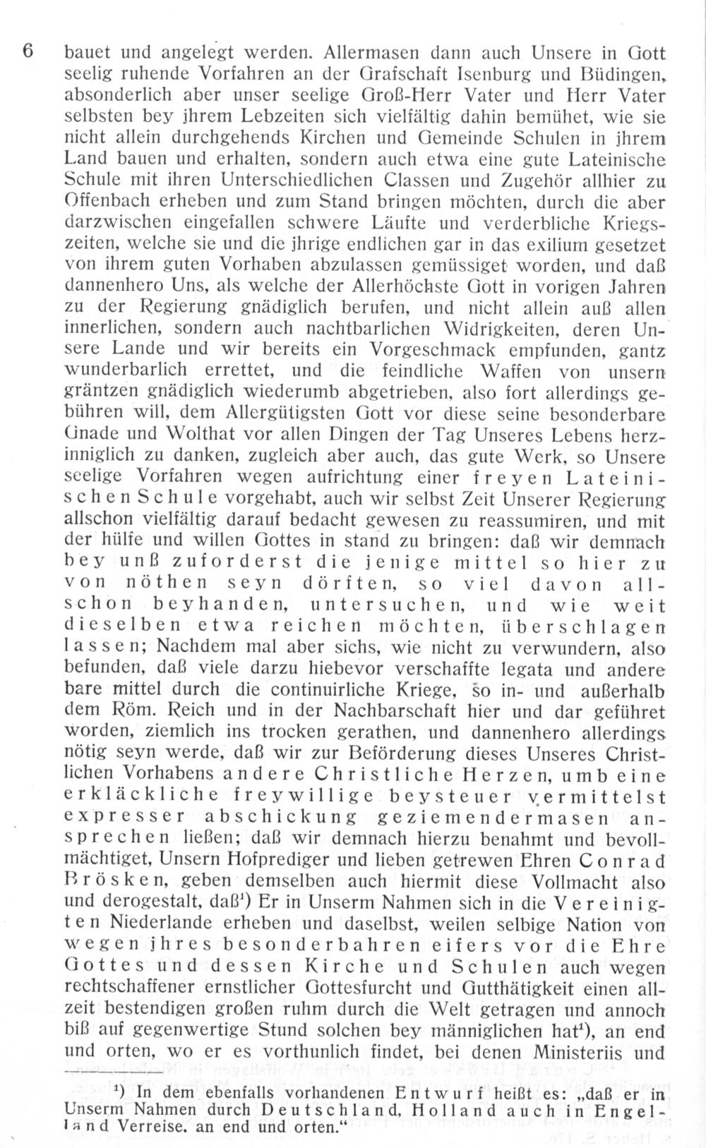 bauet und angelegt werden. Allermasen dann auch Unsere in Gott seelig ruhende Vorfahren an der Grafschaft Isenburg und Büdingen, absonderlich aber unser seelige Groß-Herr Vater und Herr Vater selbsten bey ihrem Lebzeiten sich vielfältig dahin bemühet, wie sie nicht allein durchgehends Kirchen und Gemeinde Schulen in ihrem Land bauen und erhalten, sondern auch etwa eine gute Lateinische Schule mit ihren Unterschiedlichen Classen und Zugehör allhier zu Offenbach erheben und zum Stand bringen möchten, durch die aber darzwischen eingefallen schwere Läufte und verderbliche Kriegs-— Zeiten, welche sie und die ihrige endlichen gar in das exilium gesetzet von ihrem guten Vorhaben abzulassen gemüssiget worden, und daß dannenhero Uns, als welche der Allerhöchste Gott in vorigen Jahren zu der Regierung gnädiglich berufen, und nicht allein auß allen innerlichen, sondern auch nachtbarlichen Widrigkeiten, deren Un- sere Lande und wir bereits ein Vorgeschmack empfunden, gantz wunderbarlich errettet, und die feindliche Waffen von unsern gräntzen gnädiglich wiederumb abgetrieben, also fort allerdings ge— bühren will, dem Allergütigsten Gott vor diese seine besonderbare Gnade und Wolthat vor allen Dingen der Tag Unseres Lebens herz-— inniglich zu danken, zugleich aber auch, das gute Werk, so Unsere seelige Vorfahren wegen aufrichtung einer freyen Lateini- schenSchule vorgehabt, auch wir selbst Zeit Unserer Regierung allschon vielfältig darauf bedacht gewesen zu reassumiren, und mit der hülfe und willen Gottes in stand zu bringen: daß wir demnach bey unß zuforderst die jenige mittel so hier zu von nöthen seyn dörften, So viel davon all-— schon beyhanden, untersuchen, und wie weit dieselben etwa reichen möchten, überschlagen lassen; Nachdem mal aber sichs, wie nicht zu verwundern, also befunden, daß viele darzu hiebevor verschaffte legata und andere bare mittel durch die continuirliche Kriege, so in- und außerhalb dem Röm. Reich und in der Nachbarschaft hier und dar geführet worden, ziemlich ins trocken gerathen, und dannenhero allerdings nötig seyn werde, daß wir zur Beförderung dieses Unseres Christ— lichen Vorhabens andere Christliche Herzen, umb eine erkläckliche freywillige beysteuer vermittelst eXxpresser abschickung geziemendermasen an-— sprechen ließen; daß wir demnach hierzu benahmt und bevoll- mächtiget, Unsern Hofprediger und lieben getrewen Ehren Conrad Brösken, geben demselben auch hiermit diese Vollmacht also und derogestalt, daß“) Er in Unserm Nahmen sich in die Vereinig- ten Niederlande erheben und daselbst, weilen selbige Nation von wegen ihres besonderbahren eifers vor die FEhre Gottes und dessen Kirche und Schulen auch wegen rechtschaffener ernstlicher Gottesfurcht und Gutthätigkeit einen all- zeit bestendigen großen ruhm durch die Welt getragen und annoch biß auf gegenwertige Stund solchen bey männiglichen hati), an end und orten, wo er es vorthunlich findet, bei denen Ministeriis und