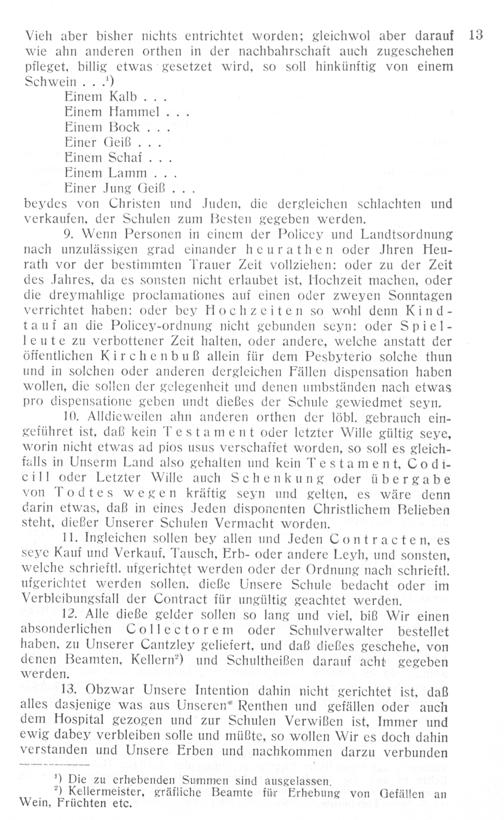 13. Obzwar Unsere Intention dahin nicht gerichtet ist, daß alles dasjenige was aus Unseren Renthen und gefällen oder auch dem Hospital gezogen und zur Schulen Verwißen ist, Immer und ewig dabey verbleiben solle und müßte, so wollen Wir es doch dahin verstanden und Unsere Erben und nachkommen darzu verbunden