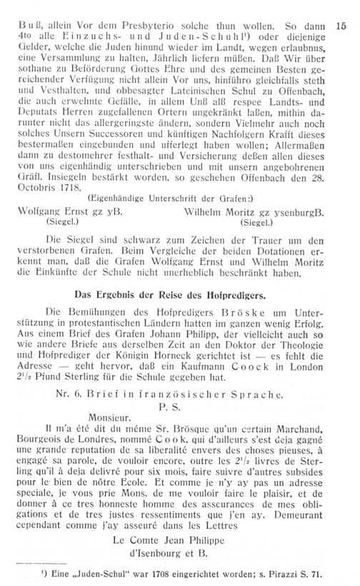Buß, allein Vor dem Presbyterio solche thun wollen. So dann 4to alle Einzuchs- und Juden-Schuhl“¹) oder diejenige Gelder, welche die Juden hinund wieder im Landt, wegen erlaubnus, eine Versammlung zu halten, Jährlich liefern müßen. Daß Wir über sothane zu Beförderung Gottes Ehre und des gemeinen Besten ge-— reichender Verfügung nicht allein Vor uns, hinführo gleichfalls steth und Vesthalten, und obbesagter Lateinischen Schul zu Offenbach, die auch erwehnte Gefälle, in allem Unß alß respee Landts- und Deputats Herren zugefallenen Ortern ungekränkt laßen, mithin da- runter nicht das allergeringste ändern, sondern Vielmehr auch noch solches Unsern Successoren und künftigen Nachfolgern Krafft dieses bestermaßen eingebunden und ufferlegt haben wollen; Allermaßen dann zu destomehrer festhalt- und Versicherung deßen allen dieses von uns eigenhändig unterschrieben und mit unsern angebohrenen Gräfl. Insiegeln bestärkt worden, so geschehen Offenbach den 28. Octobris 1718. (Eigenhändige Unterschrift der Grafen:)