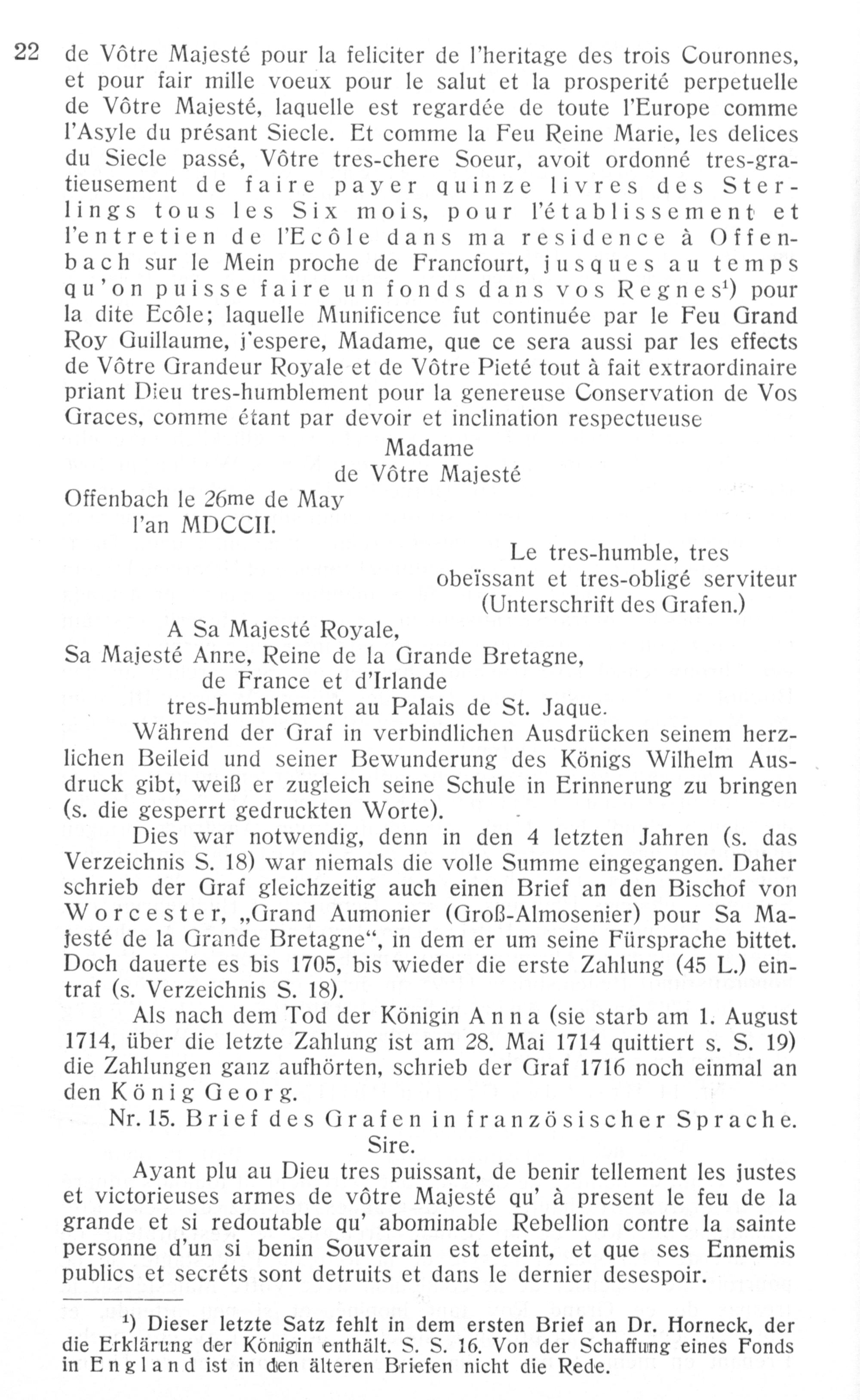 22 de Vôtre Majesté pour la feliciter de l'heritage des trois Couronnes, et pour fair mille voeux pour le salut et la prosperité perpetuelle de Vôtre Majesté, laquelle est regardée de toute l'Europe comme l'Asyle du présant Siecle. Et comme la Feu Reine Marie, les delices du Siecle passé, Vôtre tres-chere Soeur, avoit ordonné tres-gra— tieusement de faire payer qPuinze livres des Ster— lings tous les Six mois, pour l'établissement et l'entretien de l'Eoòôle dans maresidence à Offen-— bach sur le Mein proche de Francfourt, ſusques au temps qu'on puisse faire un fonds dans vos Regnesi) pour la dite Ecôle; laquelle Munificence fut continuée par le Feu Grand Roy Cuillaume, j'espere, Madame, que ce sera aussi par les effects de Vôtre Grandeur Royale et de Vôtre Pieté tout à fait extraordinaire priant Dieu tres-humblement pour la genereuse Conservation de Vos Graces, comme étant par devoir et inclination respectueuse