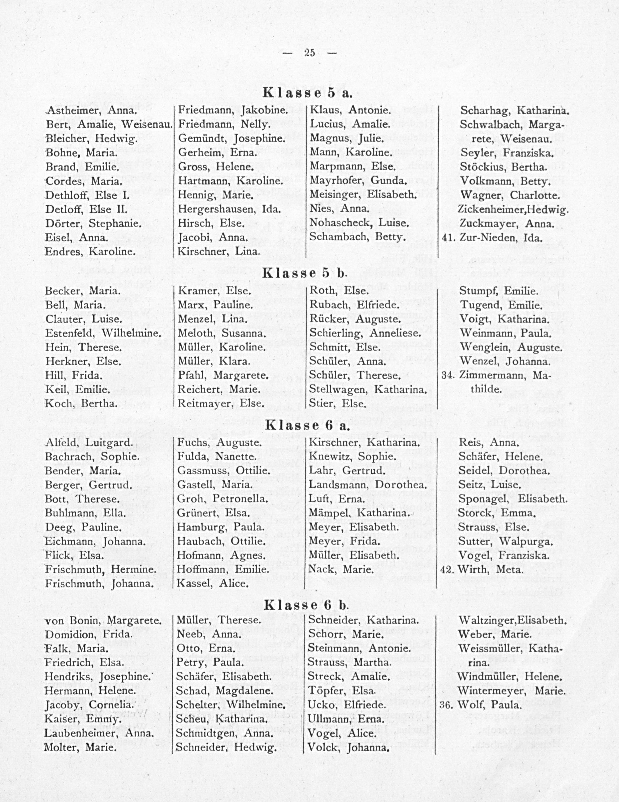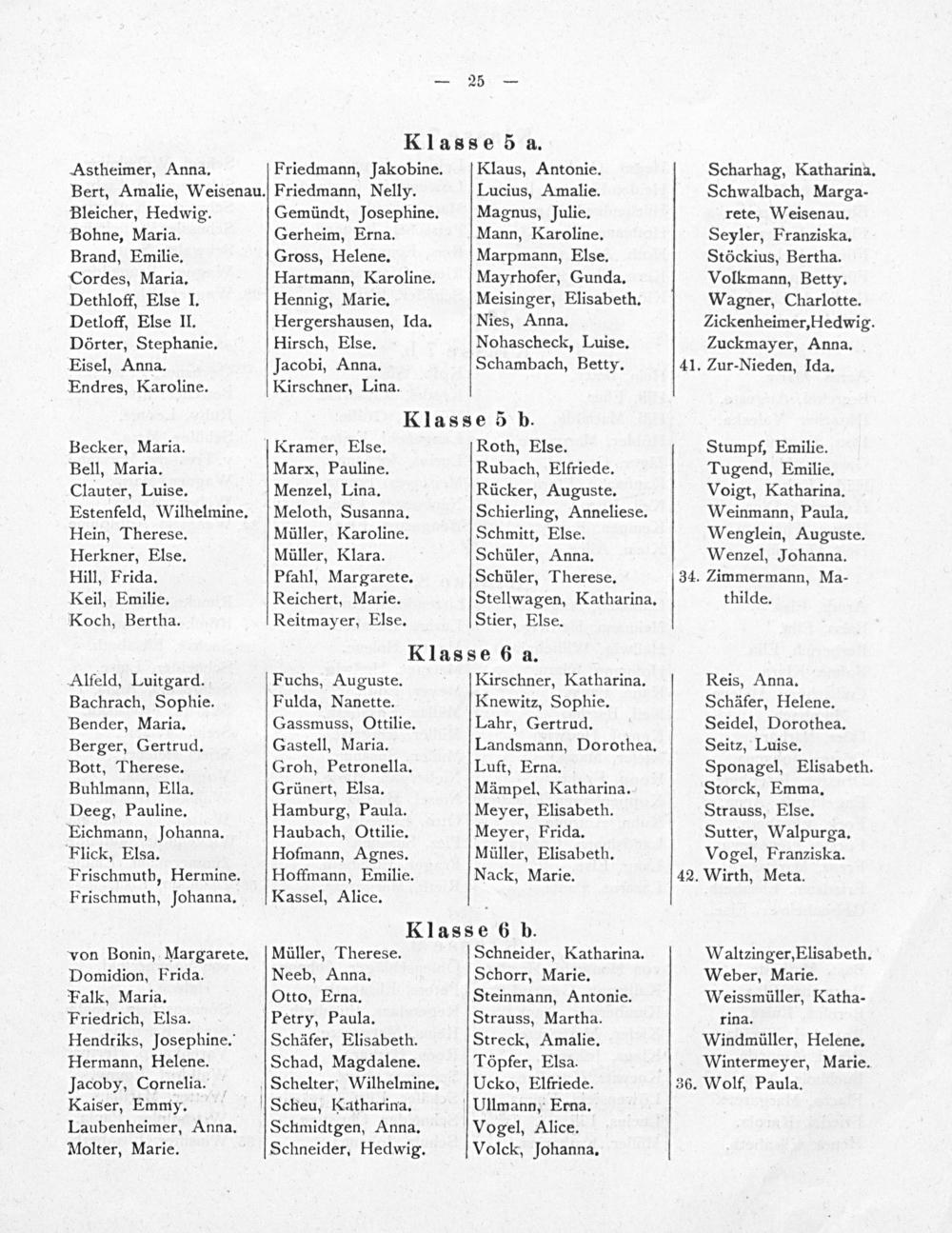 Friedmann, Jakobine. Friedmann, Nelly. Gemündt, Josephine. Gerheim, Erna. Gross, Helene. Hartmann, Karoline. Hennig, Marie. Hergershausen, Ida. Hirsch, Else. Jacobi, Anna. Kirschner, Lina.