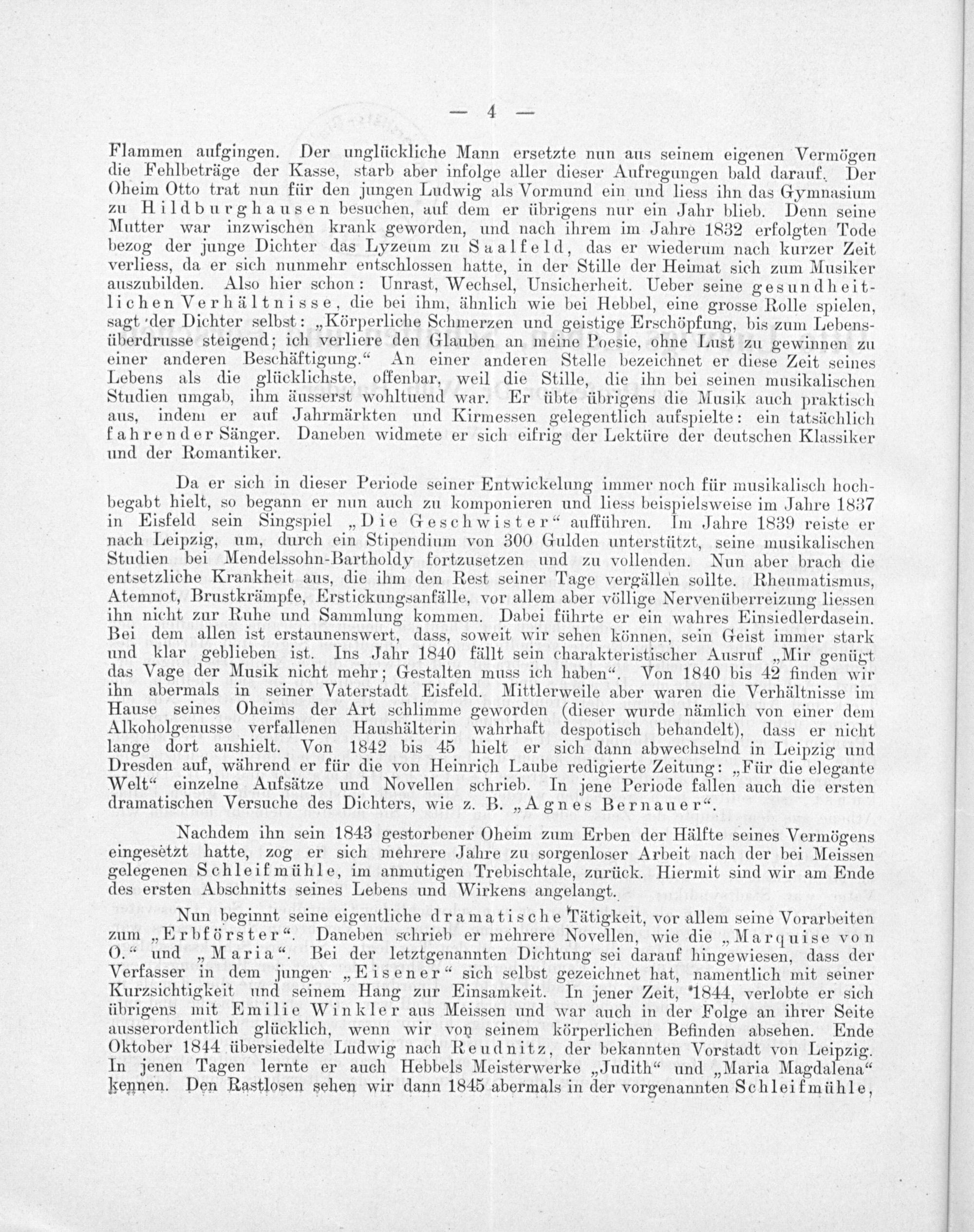 Nun beginnt seine eigentliche dramatische Tätigkeit, vor allem seine Vorarbeiten zum„Erbförster“. Daneben schrieb er mehrere Novellen, wie die„Marquise von 0.“ und„Mariau. Bei der letztgenannten Dichtung sei darauf hingewiesen, dass der Verfasser in dem jungen„Eisener“ sich selbst gezeichnet hat, namentlich mit seiner Kurzsichtigkeit und seinem Hang zur Einsamkeit. In jener Zeit, 1844, verlobte er sich übrigens mit Emilie Winkler aus Meissen und war auch in der Folge an ihrer Seite ausserordentlich glücklich, wenn wir von seinem körperlichen Befinden absehen. Ende Oktober 1844 übersiedelte Ludwig nach Reudnitz, der bekannten Vorstadt von Leipzig. In jenen Tagen lernte er auch Hebbels Meisterwerke„Judith“ und„Maria Magdalena“ kennen. Den Rastlosen sehen wir dann 1845 abermals in der vorgenannten Schleifmühle,