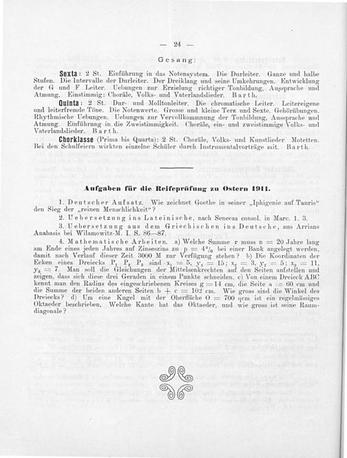 Quinta: 2 St. Dur- und Molltonleiter. Die chromatische Leiter. Leitereigene und leiterfremde Töne. Die Notenwerte. Grosse und kleine Terz und Sexte. Gehörübungen. Rhythmische Uebungen. Uebungen zur Vervollkommnung der Tonbildung, Aussprache und Atmung. Einführung in die Zweistimmigkeit. Choräle, ein- und zweistimmige Volks- und Vaterlandslieder. Barth.