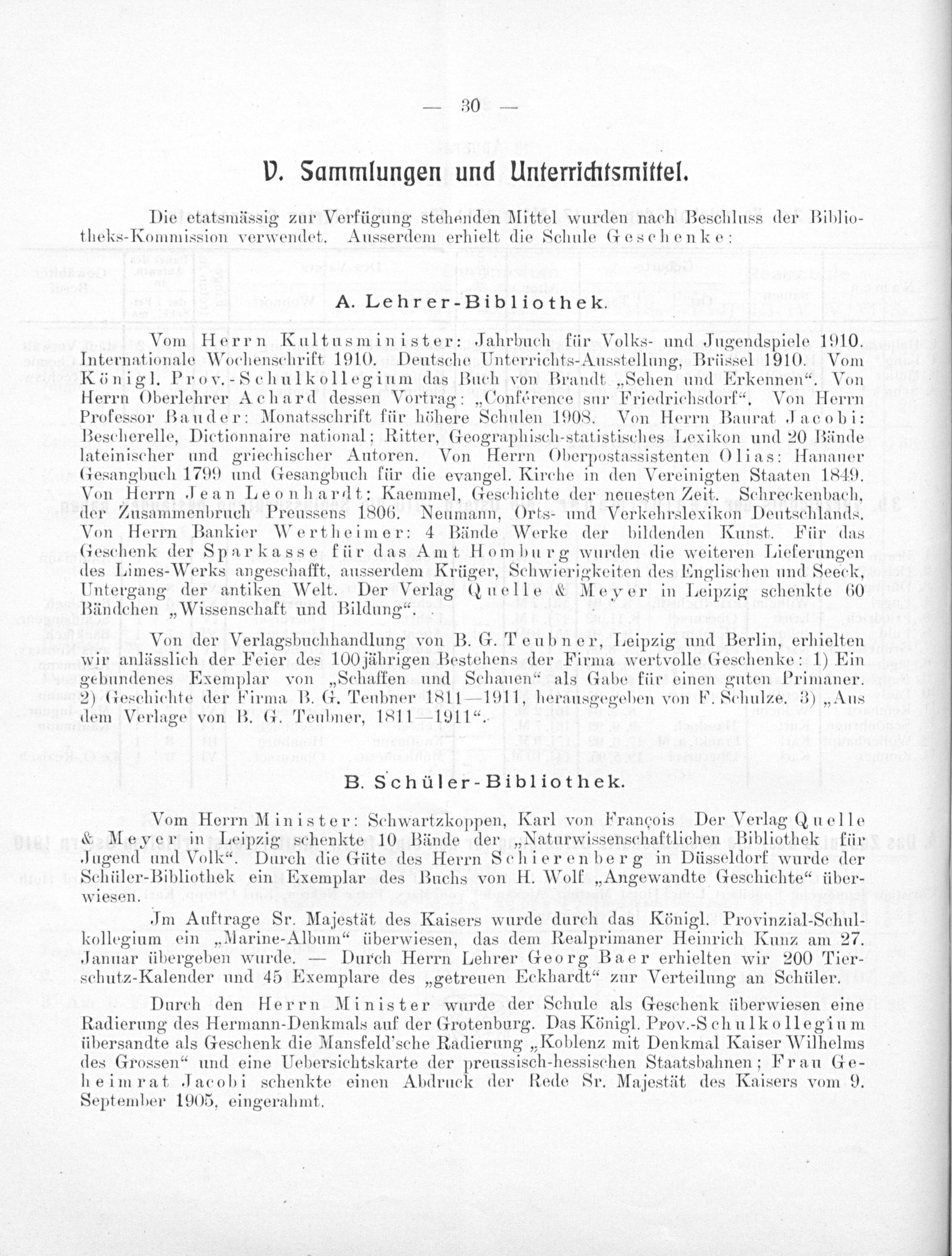 Vom Herrn Kultusminister: Jahrbuch für Volks- und Jugendspiele 1910. Internationale Wochenschrift 1910. Deutsche Unterrichts-Ausstellung, Brüssel 1910. Vom Königl. Prov.-Schulkollegium das Buch von Brandt„Sehen und Erkennen“. Von Herrn Oberlehrer Achard dessen Vort trag:„Conférence sur Friedrichsdorf“. Von Uerrn Professor Bauder: Monatsschrift für höhere Schulen 1908. Von Herrn Baurat Jacobi: Bescherelle, Dictionnaire national; Ritter, Geographisch-statistisches Lexikon und 20 Bände lateinischer und griechischer Autoren. Von Herrn Oberpostassistenten Olias: Hananer Gesangbuch 1799 und Gesangbuch für die evangel. Kirche in den Vereinigten Standen 1849. Von lier rn Jean Leonhardt: Kaemmel, Geschichte der neuesten Zeit. Schreckenbach, der Zusammenbruch Preussens 1806. Neumann, Orts- und Verkehrslexikon Deutschlands. Von Herrn Bankier Wertheimer: 4 Bände Werke der bildenden Kunst. Für das Geschenk der Sparkasse für das Amt Homburg wurden die weiteren Lieferungen des Limes-Werks angeschafft, ausserdem Kriüger, Schwierigkeiten des Englischen und Seee k, Untergang der antiken Welt. Der Verl ag 0 uelle& Key er in Leipzig schenkte 60