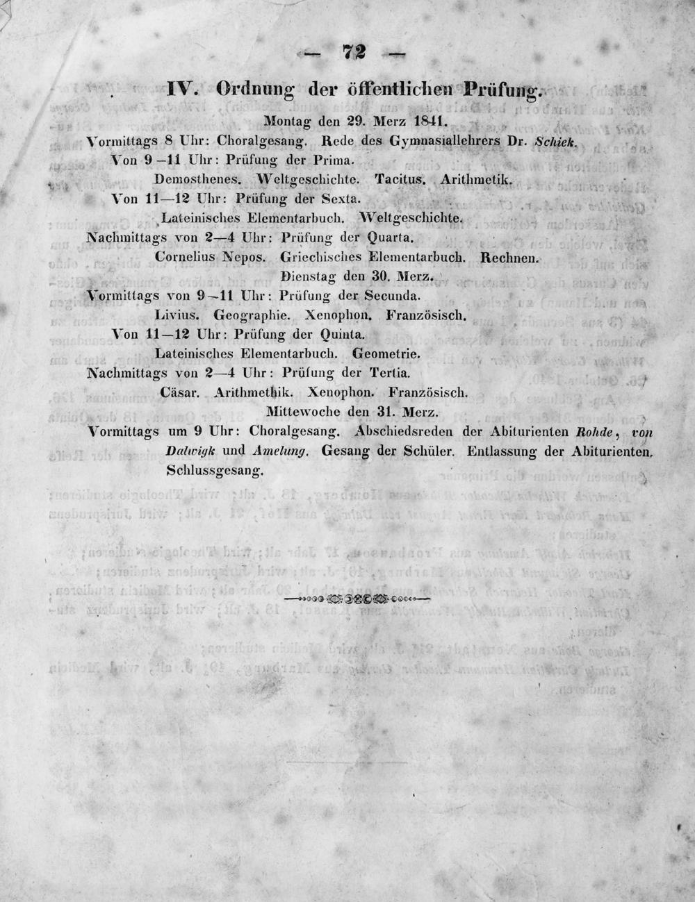 Montag den 29. Merz 1841. Vormittags 8 Uhr: Choralgesang. Rede des Gymnasiallehrers Dr. Schiek. Von 9- 11 Uhr: Prüfung der Prima. Demosthenes. Weltgeschichte. Tacitus. Arithmetik. Von 11—12 Uhr: Prüfung der Sexta.— Lateinisches Elementarbuch. Weltgeschichte. Nachmittags von 2—4 Uhr: Prüfung der Quarta. Cornelius Nepos. Griechisches Elementarbuch. Rechnen. Dienstag den 30. Merz. Vormittags von 9— 11 Uhr: Prüfung der Secunda. Livius. Geographie. Xenophon. Französisch. Von 11—12 Uhr: Prüfung der Quinta. Lateinisches Elementarbuch. Geometrie. Nachmittags von 2—4 Uhr: Prüfung der Tertia. Cäsar. Arithmethik. Xenophon. Französisch. Mittewoche den 31. Merz. 4 Vormittags um 9 Uhr: Choralgesang. Abschiedsreden der Abiturienten Rohde, ron Dalwigk und Amelung. Gesang der Schüler. Entlassung der Abiturienten. Schlussgesang.