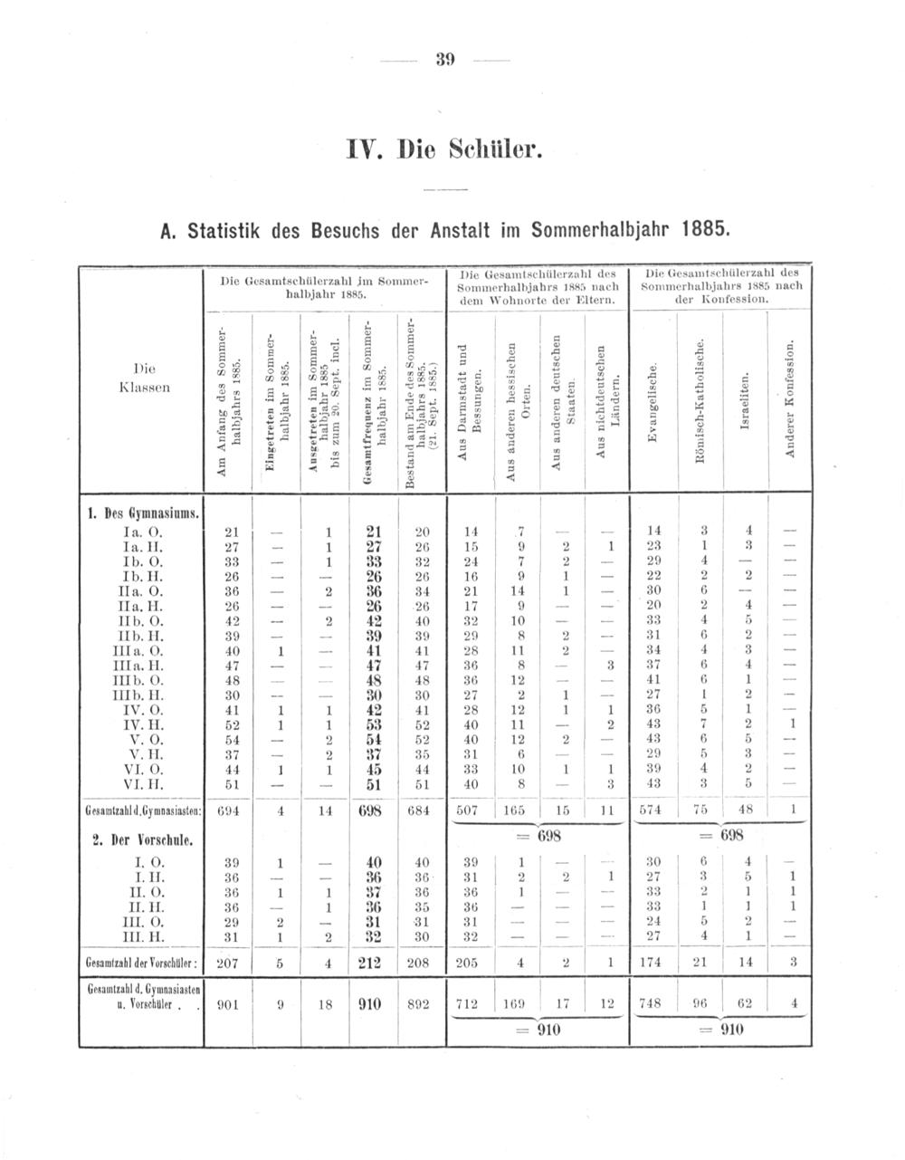 ie Ge pn 8 8. Die Gesamtschülerzahl des Die Gesamtschülerzahl des Die Gesamtsonnered nn Sommer- Sommerhalbjahrs 1885 nach Sommerhalbjahrs 1885 nach 5. dem Wohnorte der Eltern. der Konfession. 7 d u 1 1 · 1——— 7 2** 2 1 5 2 5 7 5 3 5 8.. eele 24. 2 Die 3 5 8 5 A S 8½ 3₰ 2 5 5 à ½ ½ 255 35 223 2 2 2 3 Klassen 3 7 22ſ825 5 2 SS238 ſ 5 8½8 2*2 5 8 E2S5 252 8 E 2. 2 5 8 S2 5 S 8 2[2 2 5 0' 25 5 5 2S555 8S8 88 285 5 V*3 4.35 22 S5 lSStse S3223s 2 5³8 5S 13 I2s 2 2AAs 2 5 5 5 S ₰ S 8 285 2 8˙— 2 3— 8₰ 2 4 2 8 82= Se 3 3 E 2 2 8 3 2 5 5 2 25 5 8 5 3 2 1 4 42 E 3 5 1 & 2 1. Des Gymnasiums. V V Ta. O. 21— 1 21 20 14 7—— 14 3 4— Ia. II. 27— 1 27 26 15 9 2 1 23 1 3— Ib. O. 33— 1 33 32 24 7 2— 29—— Ib. H. 26—— 26 26 16 V 9 1— 22 2 2— IIa. O. 36— 2 36 34 21 14 1— 30 6—— IIa. II. 26—— 26 26 17 9—— 20 2 4— IIb. O. 42— 2 42 40 32 10—— 33 4 5 IIb. II. 39—— 39 39 29 8 2— 31 6 2— IIIa. O. 40 1— 41 41 28 11 2— 34 4 3— IIIa. II. 47-—— 47 47 36 8— 3 37 6 4— IIIb. O. 48— 48 48 36 12—— 41 6 1— IIIb. II. 3⁰-—— 30 30 27 2 1— 27 1 2— IV. O. 41 1 1 42 41 28 12 1 1 36 5 1— IV. H. 52 1 1 3 52 40 11-— 2 43 7 2 1 V. O. 54— 2 54 52 40 12 2— 43 6 5— V. Hl. 37— 2 37 35 31 6— 29 53 3— VI. O. 44 1 1 45 44 33 10 1 139 4 2— VI. II. 51—— 51 51 40 8— 3 13 3 V 5 V Gewamtrnld.Gyunnsiusten. 694 4 14 698 684 507 165 15 11[674 75 48 1 2. Der Vorschule.= 698= 698 I. O. 39 1— 40 40 39 1— 30 6 4— I. II. 36—— 36 36 31 2 2 1 27 3 5 1 II. O. 36 1 1 37 36 36 1—— 33 2 111 II. II. 36— 1 36 3⁵ 36——— 33 1 1 1 III. O. 29 2— 31 31 31-——— 24 5 2 V— II HI.[31 1 2 32 30 32——— 27 4 1— 1—q1——2 ſS;ſe—2—— Gesamtzahl der Forschller: 207 5 4 212 208 205 4 V 2 1 174 21 V 14 3 Gesamtzahl d. Gymnasiasten V u. Forschüler.. 901 9 18 910 892 712 169 17 V 12 748 96 62 4 = 910= 910