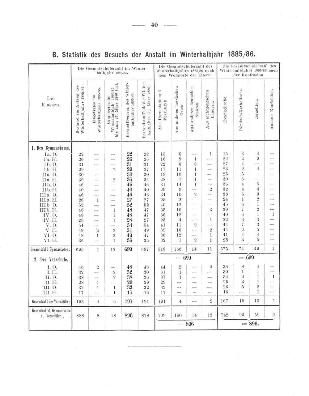 i2 eenmtseh in Wir taw. Die Gesamtschülerzahl desſ Die Gesamtschülerzahl des Die Gosanutatnaiten aa Winter- Winterhalbjahrs 1885/86 nach Winterhalbjahrs 1885/86 nach iii dem Wohnorte der Eltern. der Konfession. 5 8 3 5 V 3 3 2 2 24 E 2 s S 5 5 5 A 5 Die 223 222 2 ⅝ 2 52 5 5 2 2 5 SS= 2 2 88 3 52 2 Klassen. 5 232 15 8 823[Ss 5 V 5 8 22ee See ses 2 2 · 5 5 2ESS 5 E 282 5 1 2325 8½. 3 2 — 2 2. A₰ S. 5 2³ 8 5 S:5 4 8 3 8.,8 5 5 7 3 5 5 3 h S8 2 5 525 9 ₰ S 8 2.88 5 S2 2 A8&☛—₰ 2 ₰ 2— 2 3 5s 322“ees343 4 2 5 2 238 2S22.3 2 2 8S 5 6 ˙ S 8 5 3 2 3 2 ·3 2 5F 22 2 3232 4 2 3 58 2 8‿ p 1. Des éymnasiums. Ia. O. 22—— 22 22 15 6— 1 15 3 4— Ia. H. 26—— 26 26 16 9 1— 22 2 2— Ib. O. 31—— 31 31 22 6 3— 27 4—— Ib. H. 29— 2 29 27 17 11 1— 23 2 4— IIa. O. 30—— 30 30 19 10 1— 25 5—— IIa. II. 36- 2 36 34 28 7 1— 30 6—— IIb. O. 46—— 46 46 31 14 1. 36 4 6— IIb. H. 40—— 40 40 29 9— 2 32 4 4— IIIa. O. 46—— 46 46 34 10 2— 38 5 3— III a. H. 26 1— 27 27 25 2—— 24 1 2— IIIb O. 52—— 5² 52 40 12—— 45 6 1— III b. H. 48— 1 48 47 35⁵5 10— 3 39 7 2— IV. O. 48— 1 48 47 36 12—— 40 6 1 1 IV. H. 28— 1 28 27 22 4— 1 22 3 3— V. O. 54—— 54 54 41 11 2— 44 7 5— V. H. 49 2 2 51 49 39 10— 2 44 2 5— VI. O. 48 1 2 49 47 36 12— 1 41 4 4— VI. H. 36— 1 36 3⁵ 32 1 2 1 28 3 5— Gesamtzahld. Gymnasiasten: 695 4 12 699 687 518 156 14 V 11 575 74 49 1 2. Der Vorschule.= 699= 699 I. O. 46 2— 48 48 44 2— 2 36 8 4— I. HI. 32— 2 3² 30 31 1—— 30 1 1— II. O. 38— 2 38 36 37 1—— 34 2 1 1 II. II. 28 1— 29 29 29——— 25 3 1— III. O. 32 1 1 33 32 33——— 26 5 2— III. H. 17— 1 17 16 17——— 16— 1— Gesamtzahl der Vorschüler: 193 6 197 191 191 4— 2 167 19 V 10 1 Gesamtrahl d. Gymnasiasten u. Vorschiler.. 888 8 18 896 878 70⁰9 160 14 13 742 93 59 2 = 896= 896. —
