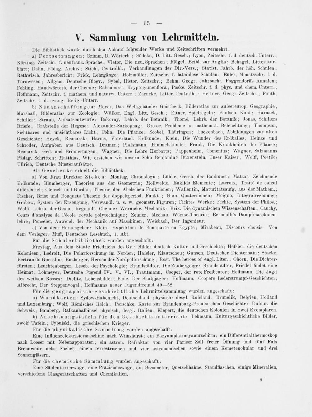 a) Fortsetzungen: Grimm, D. Wörterb.; Gödeke, D. Litt. Gesch.; Lyon, Zeitschr. f. d. deutsch. Unterr.; Körting, Zeitschr. f. neufranz. Sprache; Vietor, Die neu. Sprachen; Flügel, Beibl. zur Anglia; Behagel, Litteratur- blatt; Dahn, Pädag. Archiv; Stiehl, Centralbl.; Verhandlungen der Dir.-Vers.; Statist. Jahrb. der höh. Schnlen; Rethwisch, Jahresbericht; Frick, Lehrgänge; Holzmüller, Zeitschr. f. lateinlose Schulen; Euler, Monatsschr. f. d. Turnwesen; Allgem. Deutsche Biogr.; Sybel, Histor. Zeitschr.; Behm, Geogr. Jahrbuch; Poggendorffs Annalen; Fehling, Handwörterb. der Chemie; Rabenhorst, Kryptogamenflora; Poske, Zeitschr. f. d. phys. und chem. Unterr.; Hoffmann, Zeitschr. f. mathem. und naturw. Unterr.; Zarncke, Litter. Centralbl.; Hettner, Geogr. Zeitschr.; Fauth, Zeitschr. f. d. evang. Relig.-Unterr.
