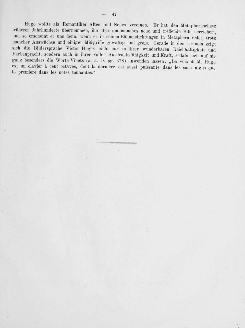 Hugo wollte als Romantiker Altes und Neues vereinen. Er hat den Metaphernschatz früherer Jahrhunderte übernommen, ihn aber um manches neue und treffende Bild bereichert, und so erscheint er uns denn, wenn er in seinen Bühnendichtungen in Metaphern redet, trotz mancher Auswüchse und einiger Miſßsgriffe gewaltig und grofs. Gerade in den Dramen zeigt sich die Bildersprache Victor Hugos nicht nur in ihrer wunderbaren Reichhaltigkeit und Farbenpracht, sondern auch in ihrer vollen Ausdrucksfähigkeit und Kraft, sodafs sich auf sie ganz besonders die Worte Vinets(a. a. O. pg. 378) anwenden lassen:„La voix de M. Hugo est un clavier à cent octaves, dont la derniere est aussi puissante dans les sons aigus que la premiere dans les notes tonnantes.“