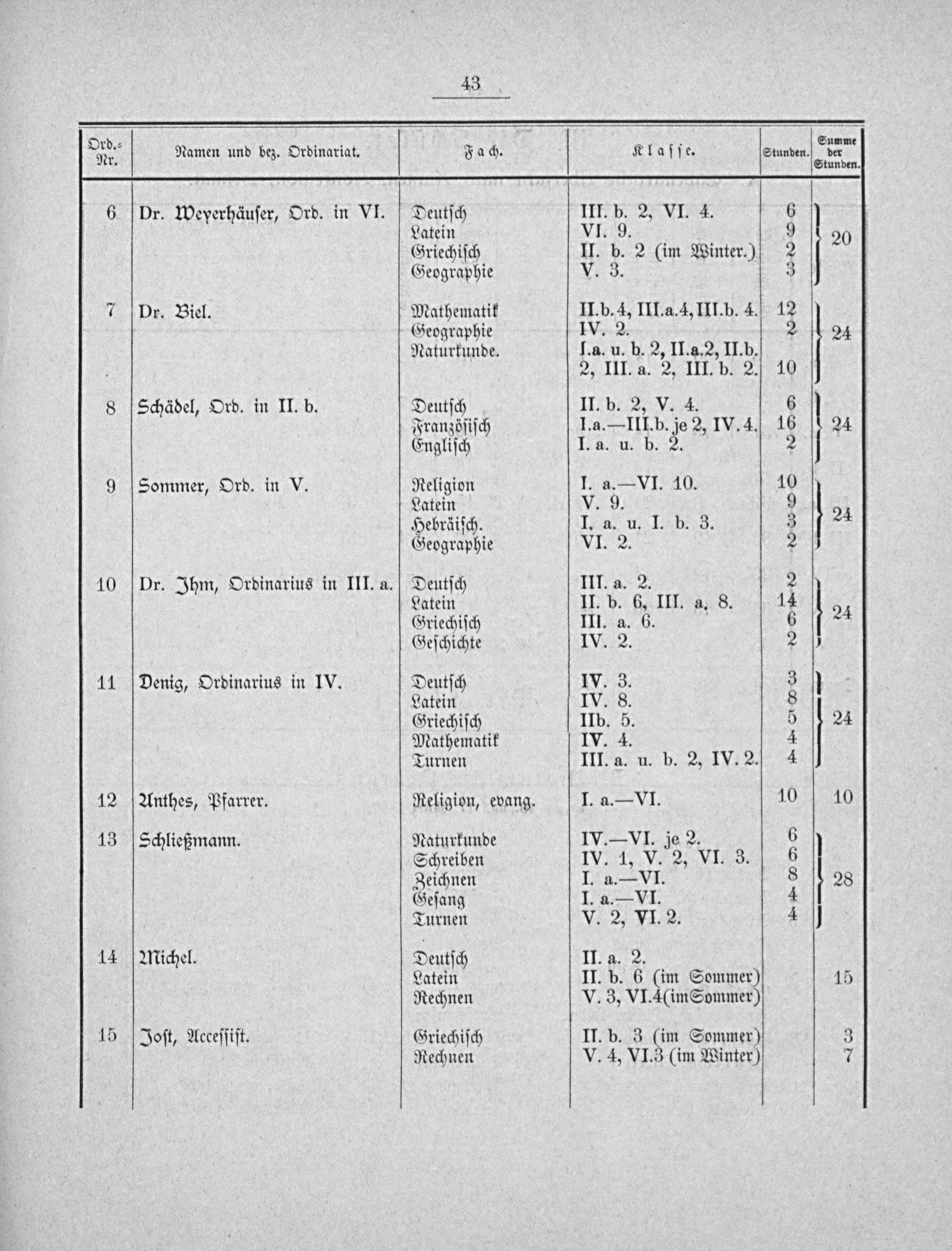 Hede⸗ Namen und bez. Ordinariat. Fach. Klaſſe. Stunden. dee⸗ 6 Dr. Weyerhäuſer, Ord. in VI. Deutſch III. b. 2, VI. 4. 6 Latein VI. 9. 9 20 Griechiſch II. b. 2(im Winter.) 2 Geographie V. 3. 3 7 Dr. Biel. Mathematik II. b. 4, III. a. 4, III. b. 4. 12 Geographie IV. 2. 2 l 24 Naturkunde. I. a. u. b. 2, II. a. 2, II. b. 2, III. a. 2, III. b. 2. 10 8 Schädel, Ord. in II. b. Deutſch II. b. 2, V. 4. 6 Franzöſiſch I. a.— III. b. je 2, IV. 4. 16 24 Engliſch I. a. u. b. 2. 2 9 Sommer, Ord. in V. Religion I. a.—VI. 10. 10 Latein V. 9. 9 24 Hebräiſch. I. a. u. I. b. 3. 3 Geographie VI. 2 2 10 Dr. Ihm, Ordinarius in III. a. Deutſch III. a. 2. 2 Latein II. b. 95 III. a. 8. 14 24 Griechiſch III. a. 6 Geſchichte IV. 84 2 11 Denig, Ordinarius in IV. Deutſch IV. 3. 3 Latein IV. 8. 8 Griechiſch IIb. 5 5 24 Mathematik IV. 4. 4 Turnen III. a. u. b. 2, IV. 2. 4 12 Anthes, Pfarrer. Religion, evang. I. a.—VI. 10 10 13 Schließmann. Naturkunde IV.—VI. je 2. 6 Schreiben IV. 1, v. 2, VI. 3. 6 Zeichnen I. a. VI. 8 l 28 Geſang I. a.-VI. 4 Turnen V. 2, VI. 2 4 14 Michel. Deutſch II. a. 2. Latein II. b. 6(im Sommer) 15 Rechnen V. 3, VI. 4(im Sommer) 15 Joſt, Acceſſiſt. Griechiſch II. b. 3(im Sommer) 3 Rechnen V. 4, VI. 3(im Winter) 7