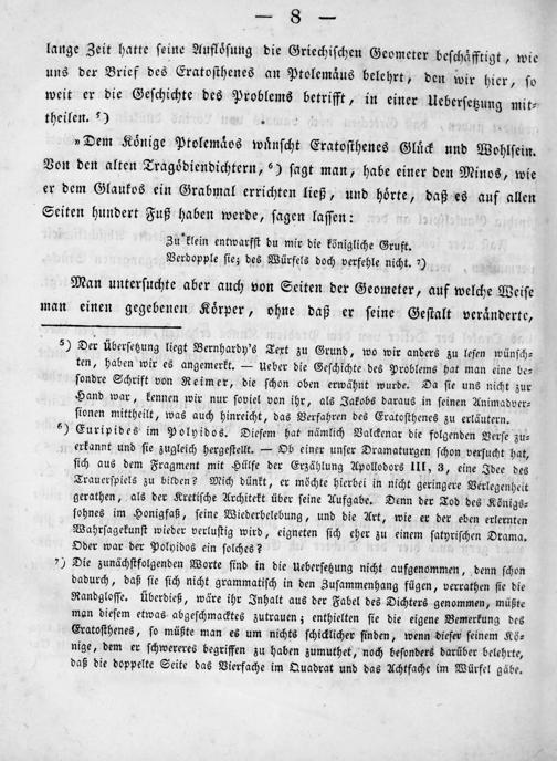 ²) Die zunächſtfolgenden Worte ſind in die Ueberſetzung nicht aufgenommen, denn ſchon dadurch, daß ſie ſich nicht grammatiſch in den Zuſammenhang fügen, verrathen ſie die Randgloſſe. überdieß, wäre ihr Inhalt aus der Fabel des Dichters genommen, müßte man dieſem etwas abgeſchmacktes zutrauen; enthielten ſie die eigene Bemerkung des Erxatoſthenes, ſo müßte man es um nichts ſchicklicher finden, wenn dieſer ſeinem Kö⸗ nige, dem er ſchwereres begriffen zu haben zumuthet, noch beſonders darüber belehrte, daß die doppelte Seite das Vierfache im Quadrat und das Achtfache im Würfel gäbe.