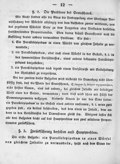 Bei der zweiten dieſer Aufgaben wird vielleicht die Bemerkung nicht uͤber⸗ fluͤſſig ſeyn, daß die Worte des Eratoſthenes, es Ereov&&rεεον οσφαμρμρυννσειν nicht heißen koͤnnen, eins ins andere, bei gleichem Inhalte mit beliebiger Wahl einer der Seiten, verwandeln; denn dieß wird ſchon mit Huͤlfe der Elementargeometrie vollzogen. Vielmehr koͤnnen ſie nur den Sinn haben: ein Parallelepipedum in die Geſtalt eines andern umformen, d. i. wenn zwei gegeben ſind, ein drittes beſchreiben, das dem einen an Inhalt, dem an⸗ dern in den Verhaͤltniſſen der Dimenſionen gleich ſey. Übrigens laſſen ſich alle drei Aufgaben leicht auf das Hauptproblem von zwei mittleren Propor⸗ tionalen zuruͤckfuͤhren.