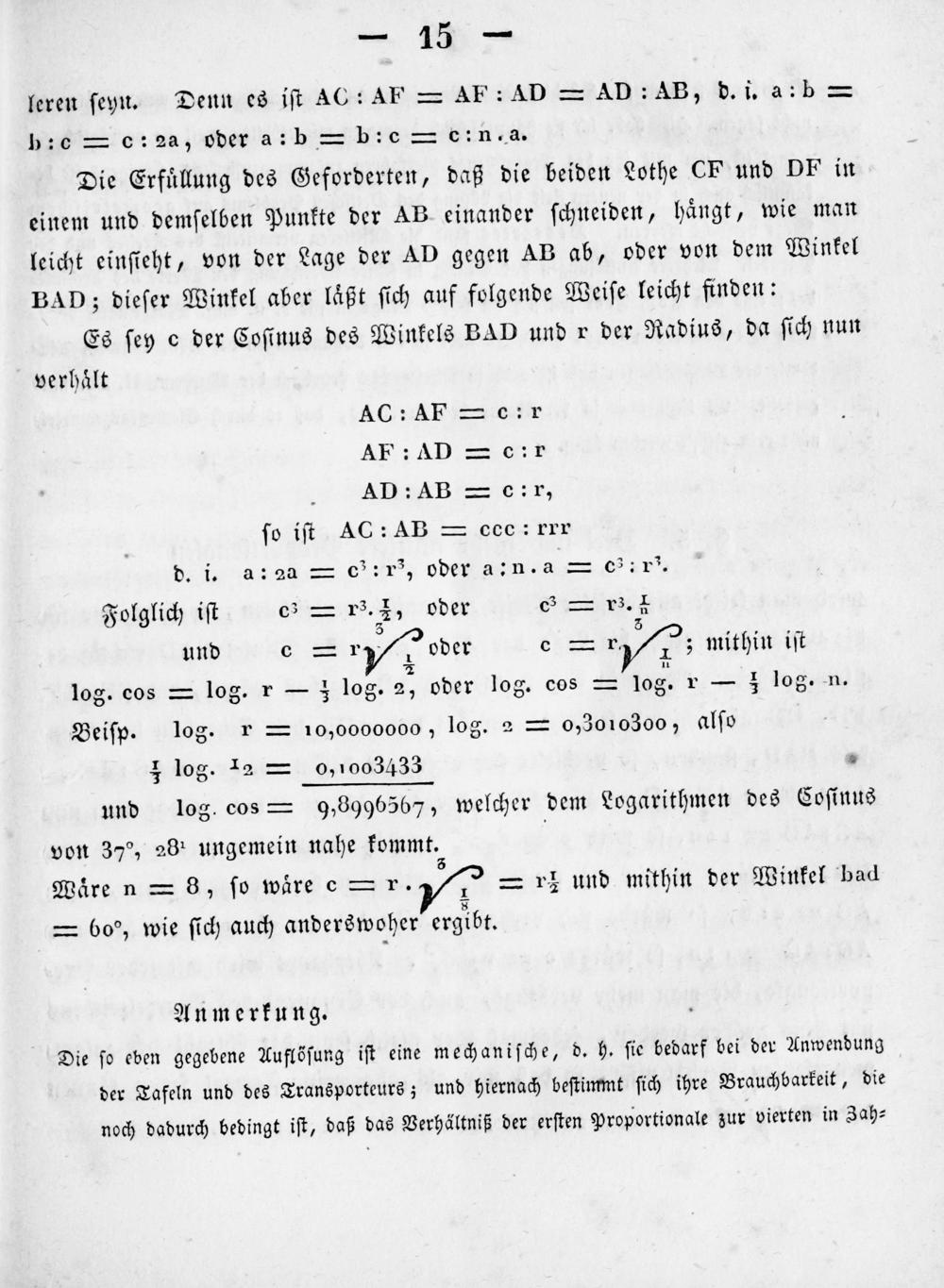 Die ſo eben gegebene Auflöſung iſt eine mechaniſche, d. h. ſie bedarf bei der Anwendung der Tafeln und des Transporteurs; und hiernach beſtimmt ſich ihre Brauchbarkeit, die noch dadurch bedingt iſt, daß das Verhältniß der erſten Proportionale zur vierten in Zah⸗