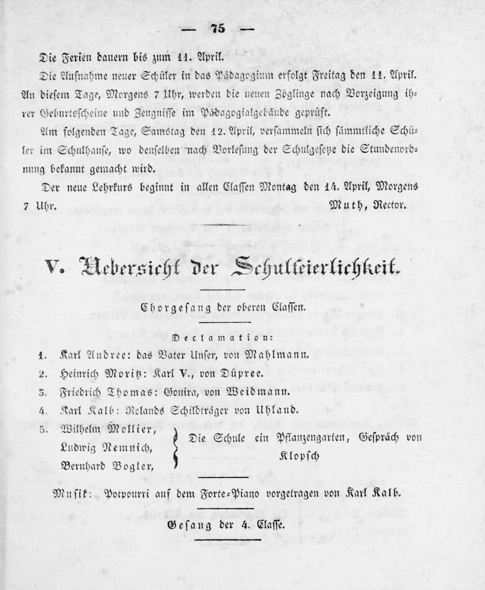 Declamation: Karl Andree: das Vater Unſer, von Mahlmann. 2. Heinrich Moritz: Karl V., von Düpree. Friedrich Thomas: Gonira, von Weidmann. 4. Karl Kalb: Rolands Schildträger von Uhland. Wilhelm Mollier, Ludwig Nemnich, Bernhard Bogler,