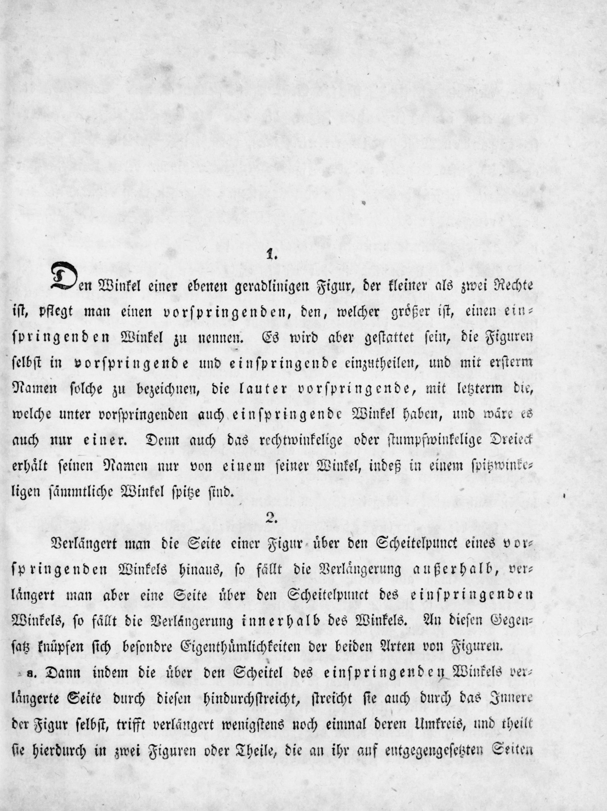 Da Winkel einer ebenen geradlinigen Figur, der kleiner als zwei Rechte iſt, pflegt man einen vorſpringenden, den, welcher groͤßer iſt, einen ein⸗ ſpringenden Winkel zu nennen. Es wird aber geſtattet ſein, die Figuren ſelbſt in vorſpringende und ei nſpringende einzutheilen, und mit erſterm Namen ſolche zu bezeichnen, die lauter vorſpringende, mit letzterm die, welche unter vorſpringenden auch einſpringende Winkel haben, und wäre es auch nur einer. Denn auch das rechtwinkelige oder ſtumpfwinkelige Dreiect erhaͤlt ſeinen Namen nur von einem ſeiner Winkel, indeß in einem ſpitzwinke⸗ ligen ſämmtliche Winkel ſpitze ſind.