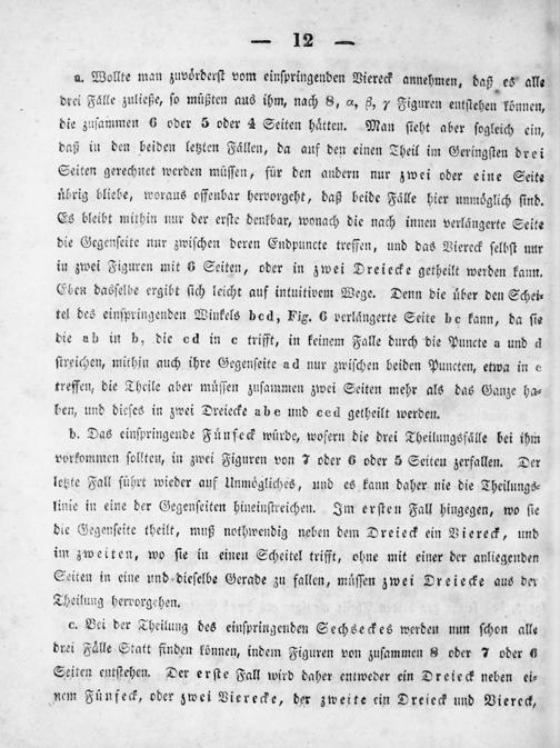 a. Wollte man zuvoͤrderſt vom einſpringenden Viereck annehmen, daß es alle drei Faͤlle zuließe, ſo müßten aus ihm, nach 8,«, 8, 7 Figuren entſtehen können, die zuſammen 6 oder 5 oder 1 Seiten haͤtten. Man ſieht aber ſogleich ein, daß in den beiden letzten Fällen, da auf den einen Theil im Geringſten drei Seiten gerechnet werden müſſen, für den andern nur zwei oder eine Seite uͤbrig bliebe, woraus offenbar hervorgeht, daß beide Fälle hier unmoͤglich ſind. Es bleibt mithin nur der erſte denkbar, wonach die nach innen verlängerte Seite die Gegenſeite nur zwiſchen deren Endpuncte treffen, und das Viereck ſelbſt nur in zwei Figuren mit 6 Seiten, oder in zwei Dreiecke getheilt werden kann. Eben dasſelbe ergibt ſich leicht auf intuitivem Wege. Denn die uͤber den Schei⸗ tel des einſpringenden Winkels bod, Fig. 6 verlängerte Seite he kann, da ſie die ab in b, die ed in c trifft, in keinem Falle durch die Puncte a und d ſtreichen, mithin auch ihre Gegenſeite ad nur zwiſchen beiden Puncten, etwa in e treffen, die Theile aber muͤſſen zuſammen zwei Seiten mehr als das Ganze ha⸗ ben, und dieſes in zwei Dreiecke abe und ced getheilt werden.