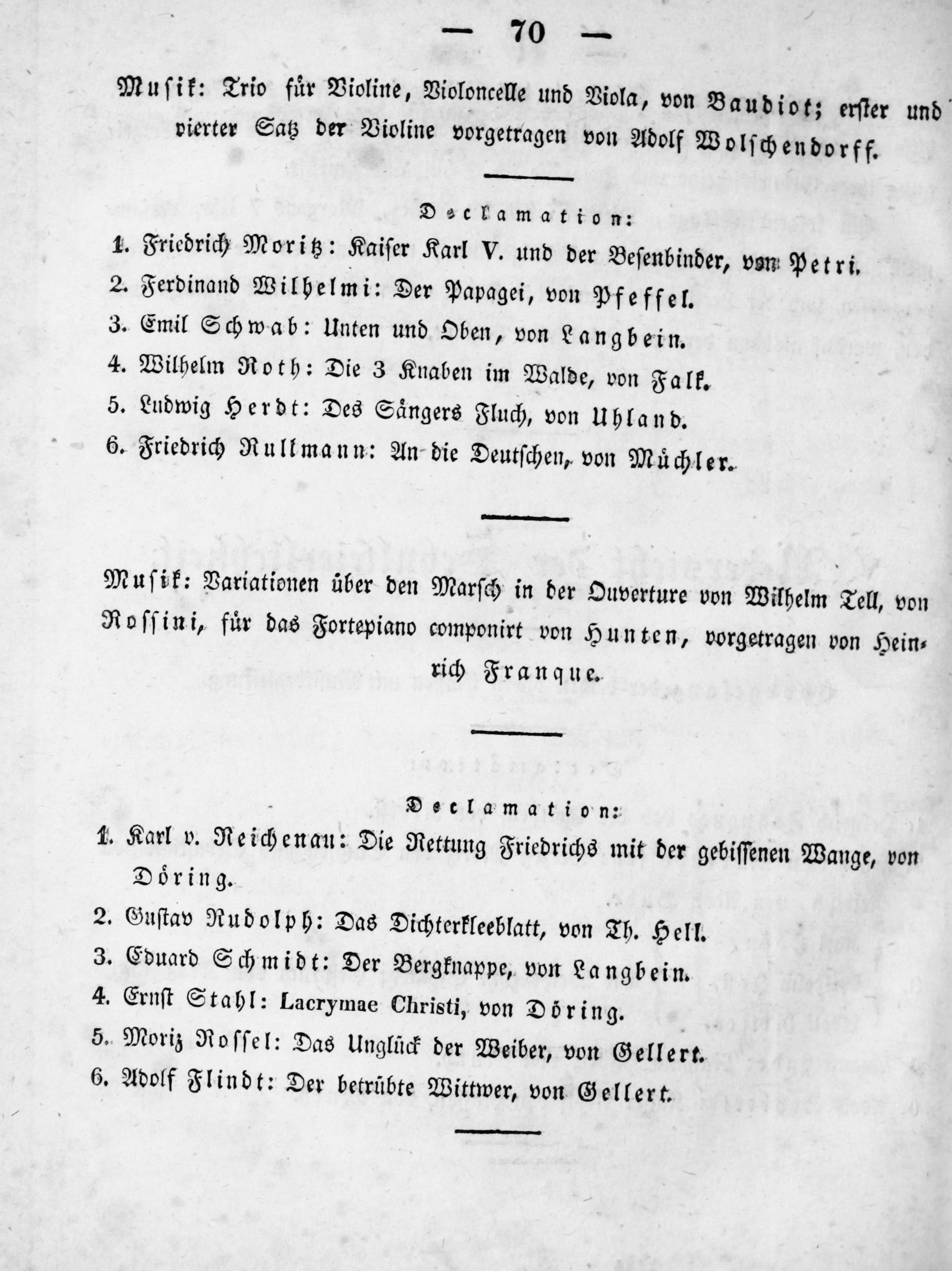 Declamation: 1. Karl v. Reichenan: Die Rettung Friedrichs mit der gebiſſenen Wange, von Doͤring. 2. Guſtav Rudolph: Das Dichterkleeblatt, von Th. Hell. 3. Eduard Schmidt: Der Bergknappe, von La ngbein. 4. Ernſt Stahl: Lacrymae Christi, von Döring. 5. Moriz Roſſel: Das Unglück der Weiber, von Gellert. 6. Adolf Flindt: Der betrübte Wittwer, von Gellert.