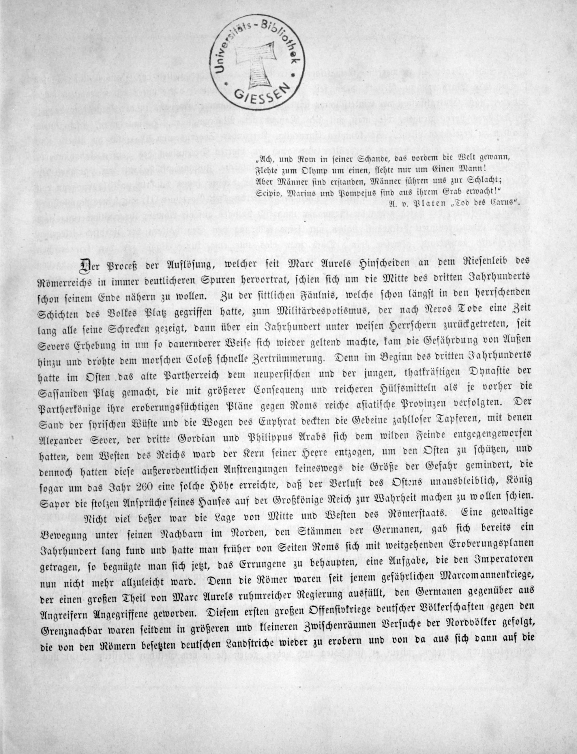 Nicht viel beßer war die Lage von Mitte und Weſten des Römerſtaats. Eine gewaltige Bewegung unter ſeinen Nachbarn im Norden, den Stämmen der Germanen, gab ſich bereits ein Jahrhundert lang kund und hatte man früher von Seiten Roms ſich mit weitgehenden Eroberungsplanen getragen, ſo begnügte man ſich jetzt, das Errungene zu behaupten, eine Aufgabe, die den Imperatoren nun nicht mehr allzuleicht ward. Denn die Römer waren ſeit jenem gefährlichen Marcomannenkriege, der einen großen Theil von Marc Aurels ruhmreicher Regierung ausfüllt, den Germanen gegenüber aus Angreifern Angegriffene geworden. Dieſem erſten großen Offenſiokriege deutſcher Völkerſchaften gegen den Grenznachbar waren ſeitdem in größeren und kleineren Zwiſchenräumen Verſuche der Nordvölker gefolgt, die von den Römern beſetzten deutſchen Landſtriche wieder zu erobern und von da aus ſich dann auf die