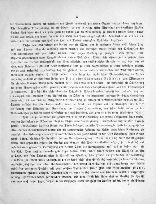 Während ſo der Vater ſein greiſes Leben an die Beſchirmung von Roms Oſtgrenzen ſetzen mußte, war der Fortbeſtand der Römerherrſchaft im Weſten unter der Regierung ſeines Sohnes nicht minder in Frage geſtellt. In Gallienus hatte ein Regent den Thron beſtiegen, in deſſen Verdammungsurtheile die Zeugniße der alten Quellen übereinſtimmend lauten und die jammervollen Zuſtände des Reichs unter ſeiner Regierung, die unaufhörlichen Erhebungen von Thronprätendenten ſollen hauptſächlich in der tiefen Verachtung ihren Grund gehabt haben, die ſeine Perſönlichkeit bei den Unterthanen genoß. Wenn nun auch die Anſchuldigungen, welche man gegen ihn erhebt, im Großen und Ganzen viel Wahres enthalten mögen, ſo drängt ſich uns doch bei einer genaueren Betrachtung von ſeinem Thun die Ueberzeugung auf, daß er beßer war, als ſein Ruf. Denn auch gar manche gute Eigenſchaften treten neben ſeinen Laſtern und Mängeln an ihm zu Tage, wie ſeine Toleranzedicte in Betreff der Chriſten, ſeine Freude an griechiſcher Geiſtesbildung, ſeine Liebe zur Muſik und Dichtkunſt, in der er ſelbſt nicht ohne Erfolg ſich verſuchte, zu beweiſen ſcheinen, und dafür, daß ihm eine edlere Anſchauungsweiſe des menſchlichen Daſeins nicht ganz fremd war, dürfte wohl ſein vertrauter Verkehr mit dem größten Philoſophen ſeiner Zeit, dem Neuplatoniker Plotin, hinreichendes Zeugnis ablegen. Daneben gibt er, wenn er ſich einmal aus ſeinem Genußleben aufzuraffen vermag, oft Proben hohen perſönlichen Muthes, wie denn ſelbſt ſein Ende nicht unrühmlich für ihn iſt, und man muß daher ſagen, daß er in der Geſchichte unter die Zahl der Fürſten gehört, denen die Sünden