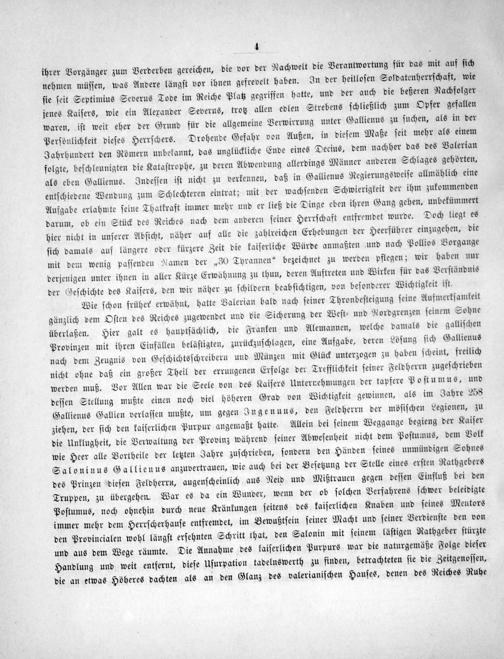 Wie ſchon früher erwähnt, hatte Valerian bald nach ſeiner Thronbeſteigung ſeine Aufmerkſamkeit gänzlich dem Oſten des Reiches zugewendet und die Sicherung der Weſt⸗ und Nordgrenzen ſeinem Sohne überlaßen. Hier galt es hauptſächlich, die Franken und Alemannen, welche damals die galliſchen Provinzen mit ihren Einfällen beläſtigten, zurückzuſchlagen, eine Aufgabe, deren Löſung ſich Gallienus nach dem Zeugnis von Geſchichtsſchreibern und Münzen mit Glück unterzogen zu haben ſcheint, freilich nicht ohne daß ein großer Theil der errungenen Erfolge der Trefflichkeit ſeiner Feldherrn zugeſchrieben werden muß. Vor Allen war die Seele von des Kaiſers Unternehmungen der tapfere Poſtumus, und deſſen Stellung mußte einen noch viel höheren Grad von Wichtigkeit gewinnen, als im Jahre 258 Gallienus Gallien verlaſſen mußte, um gegen Ingenuns, den Feldherrn der möſiſchen Legionen, zu ziehen, der ſich den kaiſerlichen Purpur angemaßt hatte. Allein bei ſeinem Weggange begieng der Kaiſer die Unklugheit, die Verwaltung der Provinz während ſeiner Abweſenheit nicht dem Poſtumus, dem Volk wie Heer alle Vortheile der letzten Jahre zuſchrieben, ſondern den Händen ſeines unmündigen Sohnes Saloninus Gallienus anzuvertrauen, wie auch bei der Beſetzung der Stelle eines erſten Rathgebers des Prinzen dieſen Feldherrn, augenſcheinlich aus Neid und Mißtrauen gegen deſſen Einfluß bei den Truppen, zu übergehen. War es da ein Wunder, wenn der ob ſolchen Verfahrens ſchwer beleidigte Poſtumus, noch ohnehin durch neue Kränkungen ſeitens des kaiſerlichen Knaben und ſeines Mentors immer mehr dem Herrſcherhauſe entfremdet, im Bewußtſein ſeiner Macht und ſeiner Verdienſte den von den Provincialen wohl längſt erſehnten Schritt that, den Salonin mit ſeinem läſtigen Rathgeber ſtürzte und aus dem Wege räumte. Die Annahme des kaiſerlichen Purpurs war die naturgemäße Folge dieſer Handlung und weit entfernt, dieſe Uſurpation tadelnswerth zu finden, betrachteten ſie die Zeitgenoſſen, die an etwas Höheres dachten als an den Glanz des valerianiſchen Hauſes, denen des Reiches Ruhe